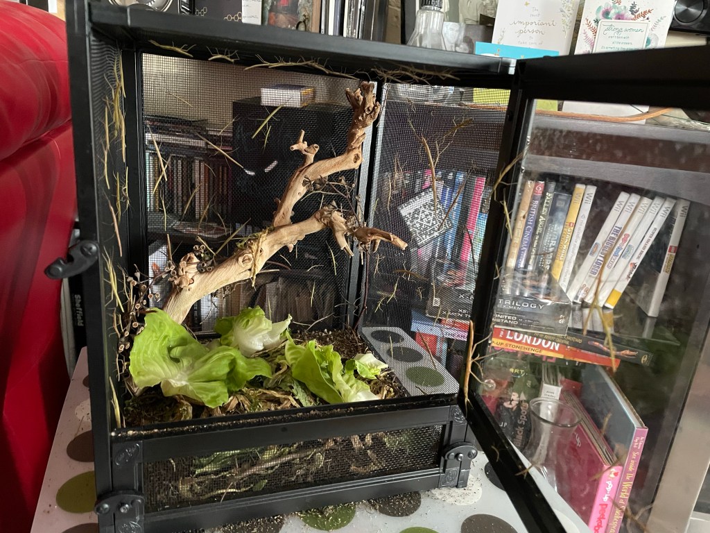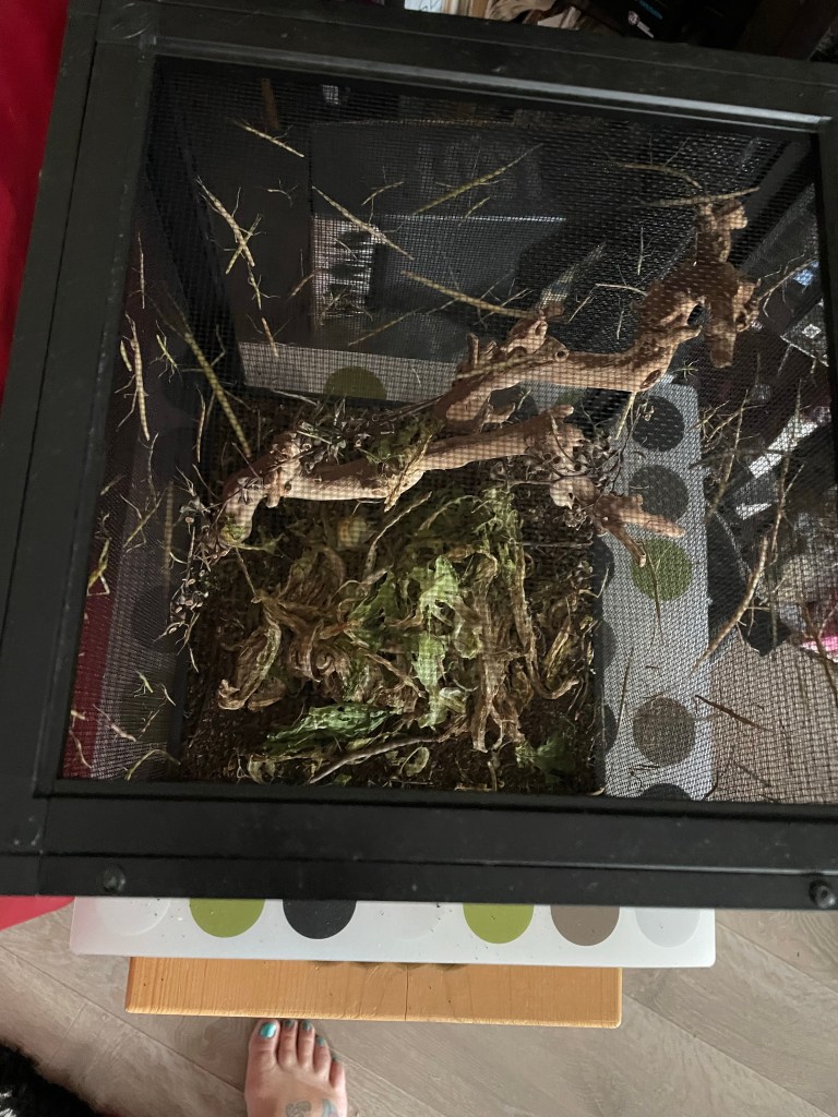 In making the rounds to feed George and the Stickbugs, I couldn’t help but notice there has been a baby boom in stickbug land. I am thinking of offering them to teachers to see if anyone wants them for a classroom. In the meantime I added lettuce to my grocery list to keep them fed. I need to clean their cage but have to make sure to put everything in a ziplock and add water to ensure there is none left to hatch as they are an invasive species.