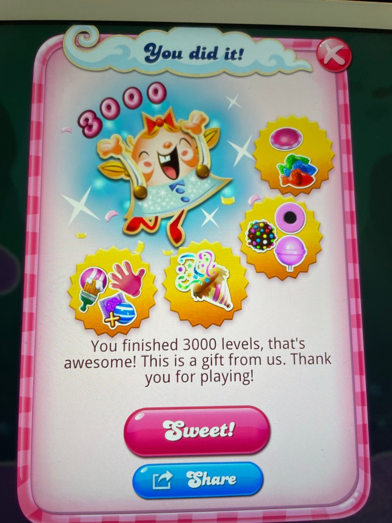 I made it to level 3000 of Candy Crash which is funny as there was a time when level 100 was a really big deal.