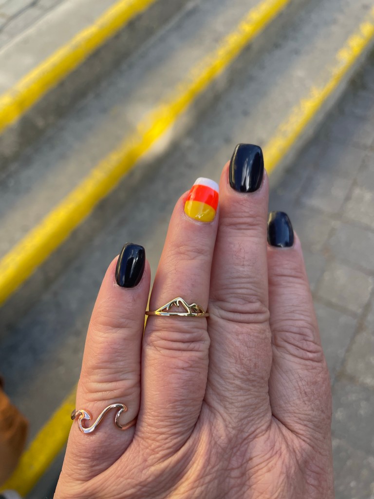 It was rainy and grey today. That seems appropriate for the first day of Fall. I got into the office at a decent time after chatting with my guests. They just keep stressing how happy they are to be staying here, that they are sleeping better and longer than they even do at home. First thing was to call to see if I could get a nail appointment as they were in very bad shape, and was very happy to get in for 11:15. I answered all my email, made a lot of payments for clients and then raced off to the mall. Minh liked my idea to get my Halloween nails and I chose candy corn. Ty finished them off and although my thumb got hurt a few times it was worth it. I love them.
