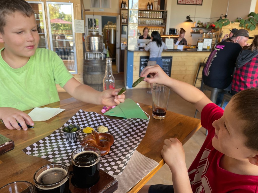 I had a solid 8 hours sleep and felt rested and ready to get my chores done. I started the pool to draining although the buyer backed out. I decided to put it on Cranbrook Bid Wars and by noon tomorrow I should have sold it. Next thing, I got a message from Rae-Anne asking if I would like to join her and the two youngest boys heading to Kimberley. I took my bottles to drop off at Beautiful Moments where they were collecting to fund a gymnastics trip, dropped my recycle in the bin behind work, stopped at Canadian Tire for latches for the two gates and dropped all my old batteries at Staples for recycling. I met her and the boys at Arby’s where she had to assist staff and Will and Sawyer were eagerly awaiting me. We all jumped in Rae’s vehicle and headed off around 1:45. Parking was hard to come by and we found out that it was Oktoberfest in the Platzl. Odd as it is still September! We puttered in and out of stores, bought a cider and wandered. It was relaxing and fun. I was super impressed with the new restaurant, The Biscuit. We didn’t eat there but we did get our passports stamped for the Ale Trail promotion going on. I have to collect 6 stamps and trade in the passport to get a really cool enamel mug. I have 4 stamps just from today. We would have got more but the OverTime was too busy. We had a good stop at Grist & Mash Brewery for a flight and a pretzel. We stopped at the skate park and let Will and Sawyer ride around on their bikes. That park is so nice, no graffiti at all. Nice to see for sure. We stopped at the park in Cranbrook as well and ran in to Jonas, their student and one of her employees who called in sick. Oops, she busted him. We dropped the kids at home and just she and I went to the Blind Pig. We had a great visit and some good food and beverages. I felt really bad as I called my favourite server by the wrong name but it will never happen again. I got all twisted up over another conversation and pulled the wrong one out of my hat. We went for a walk around downtown for a bit before I dropped her off and came home. It was such a good day!
