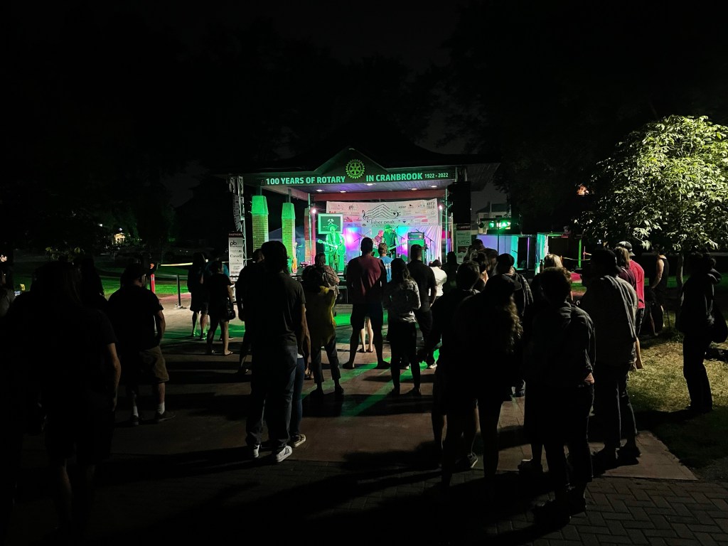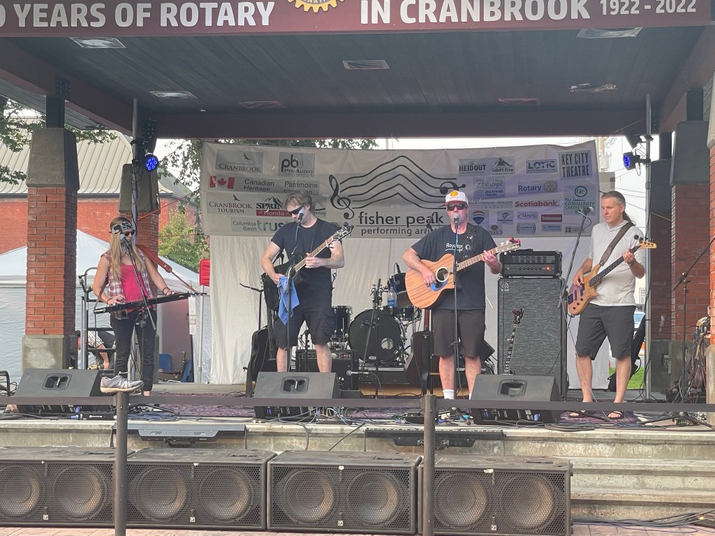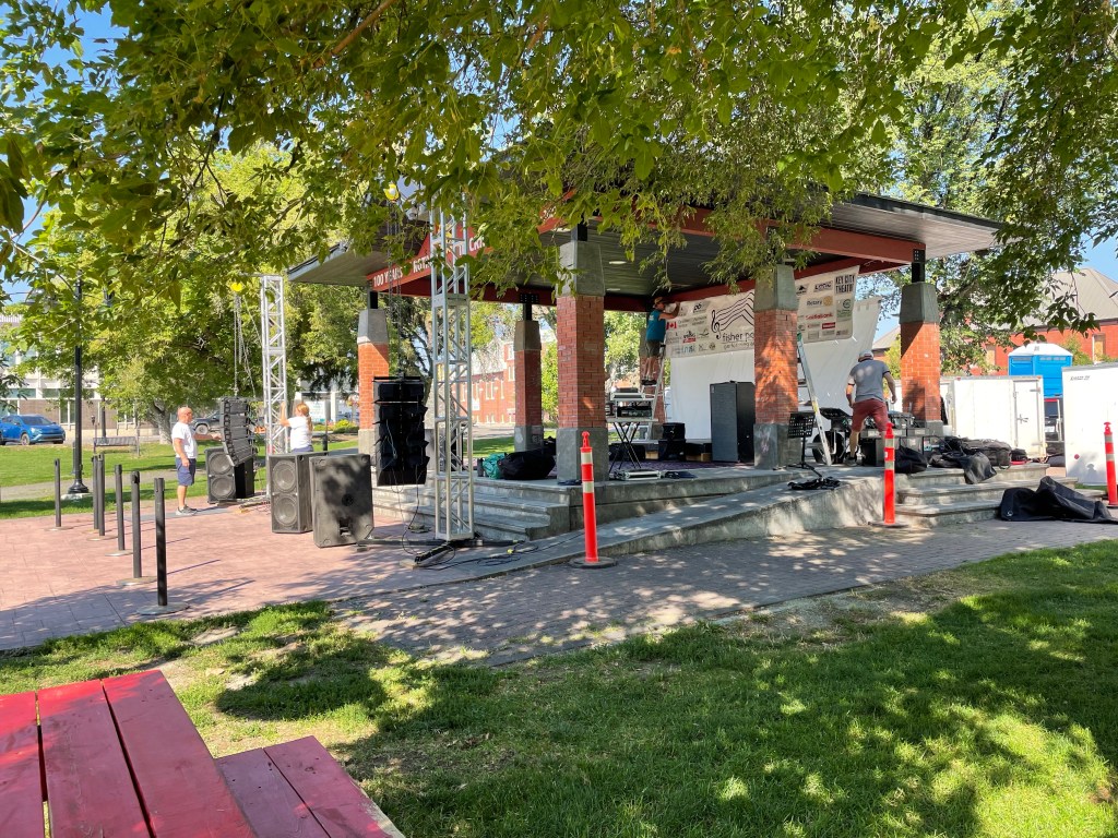 We all spent from 11:30 on setting up the whole site. We usually only use the front half of the park for Summer Sounds but we had everything set up beautifully using the whole area this time. At the back in the shade was our food truck vendor site with a bunch of picnic tables, one large area was used for Cranbrook Arts Council who had wood stacking chairs that had our logo on the backs and then people could donate and paint a chair to take home. Kya Dubois who designed our poster this year had a booth where she demonstrated her talent continuing to work on a painting she has been doing at our events all summer. The beer garden was in a new location allowing more people to see everything and opened up the shade under the big trees for more viewers who bring their lawn chairs and blankets. Key City Theatre was there to share their upcoming season as well.