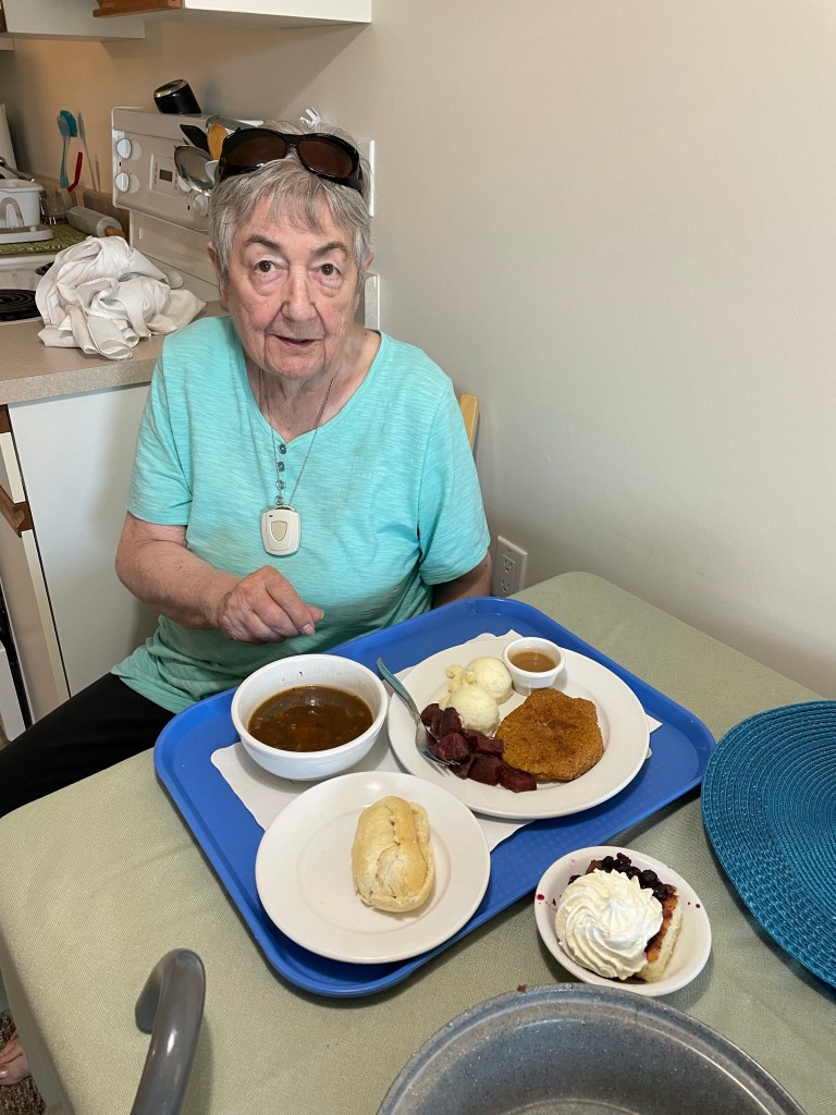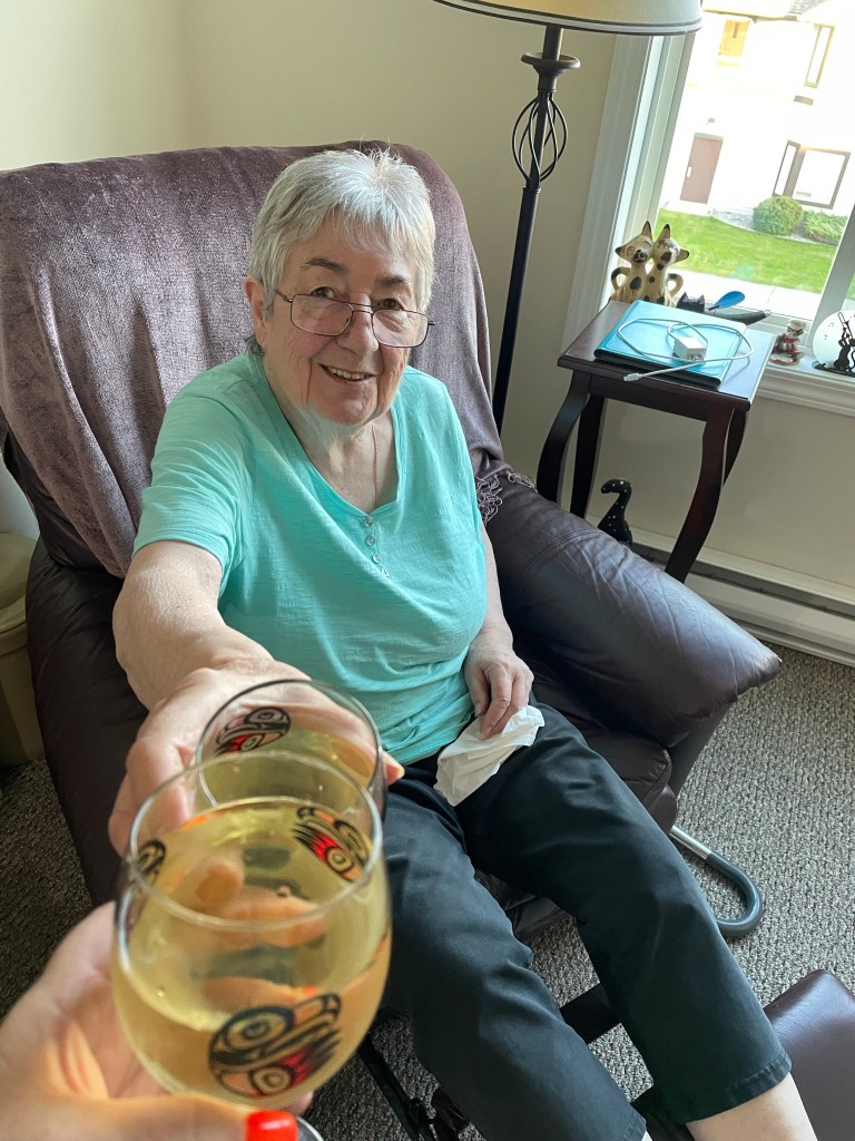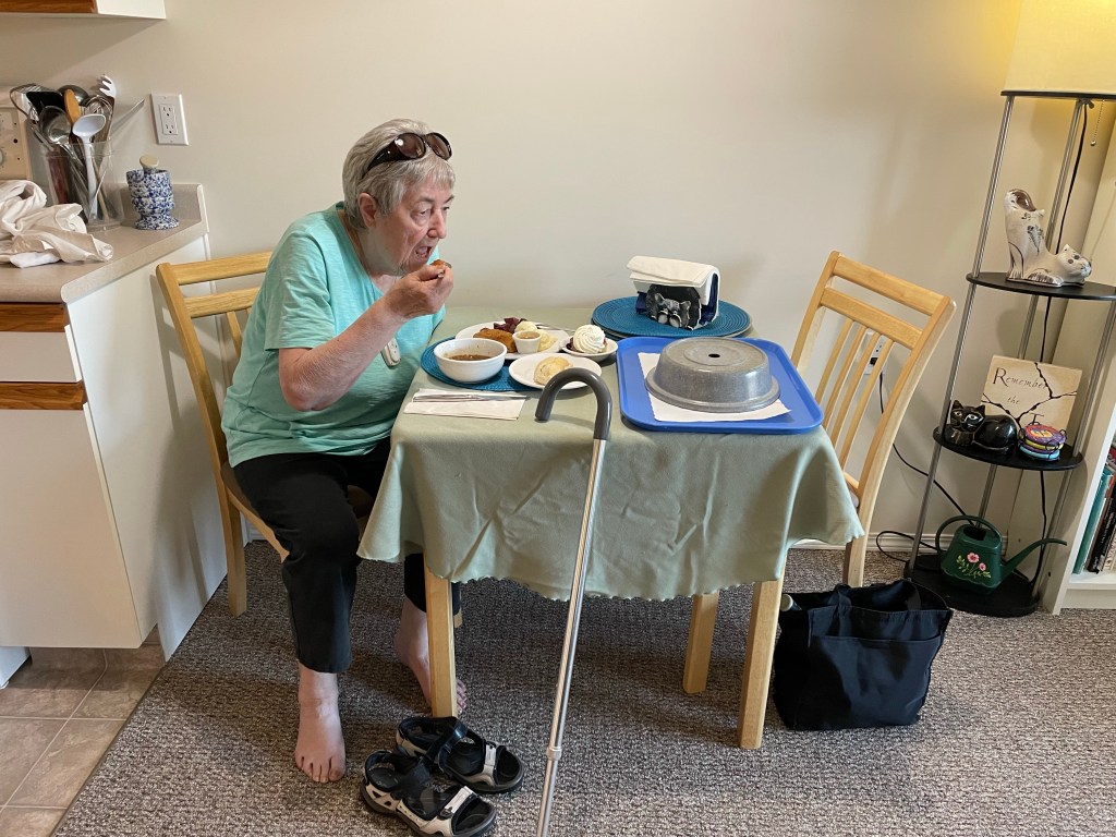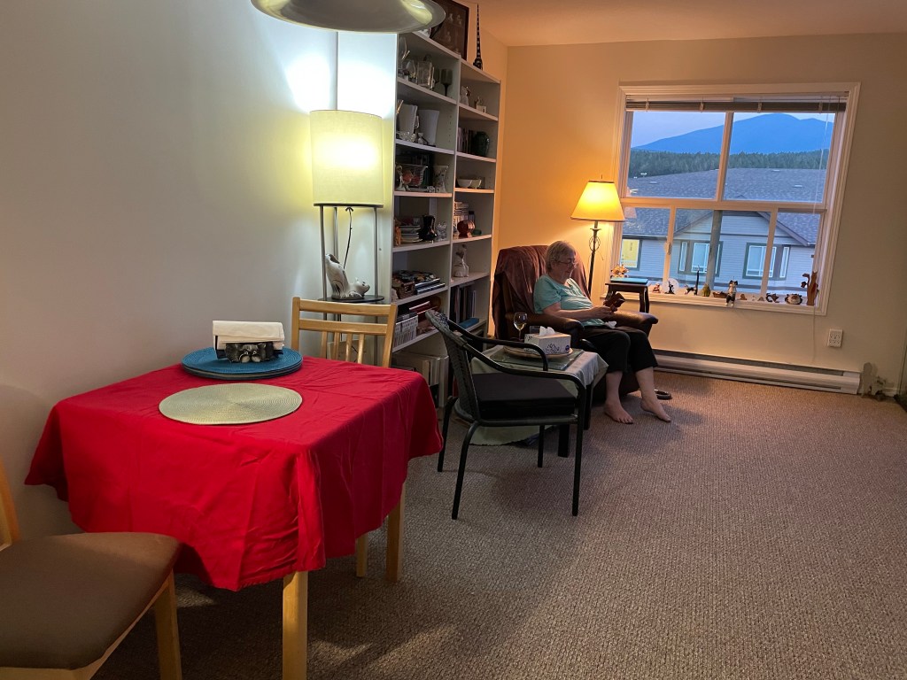 I didn’t love my alarm again but had to get my butt to the office as all the payroll ended up on this day. I also had no idea what time Mom would get here and we needed to get her there before 5 so she could get her life alarm and find out what table she would be at for dinner. Technically there is also no visitors outside of 9-5. I met her there at quarter to 5 and had to talk her into having dinner. They kindly offered to send her meal up on a tray. It was Turkey Schnitzel, Mashed potatoes, a soup and bun and a blueberry cobbler for dessert. The thing that made her squee was the side was beets. She loves them. She was so happy with how I set up and settled her apartment, loved where everything was in the kitchen and bathroom and I could tell right away how happy she was when she sat in her chair and saw the view. Also, I hooked up her router to find her internet was transferred as I had instructed her to arrange so she can use her iPad. I will have to make sure her Roku TV is connected to Netflix etc when I next go over. We had a bottle of my wine while I questioned her on a few more things that ended up in the to go bin. I am proud of her. We are going to go through all her cats as well and keep the ones she loves the most as she has over 100 of them as figurines, and even more as mugs, etc. I actually loved watching her walk around and see things, exclaiming in joy as she saw things she forgot she had. The next plan will be to hang all her pictures and collector plates. I asked her to make a list of things she needs and I will go pick up, like a broom, for example. There is housekeeping but she needs to keep it tidy. I may just pick her up a stick vacuum like I have that doubles as a dust buster. It was a very tiring day but I am so glad she is happy and I know she will sleep well. As will I 🙂