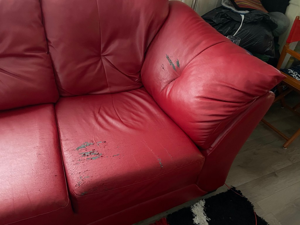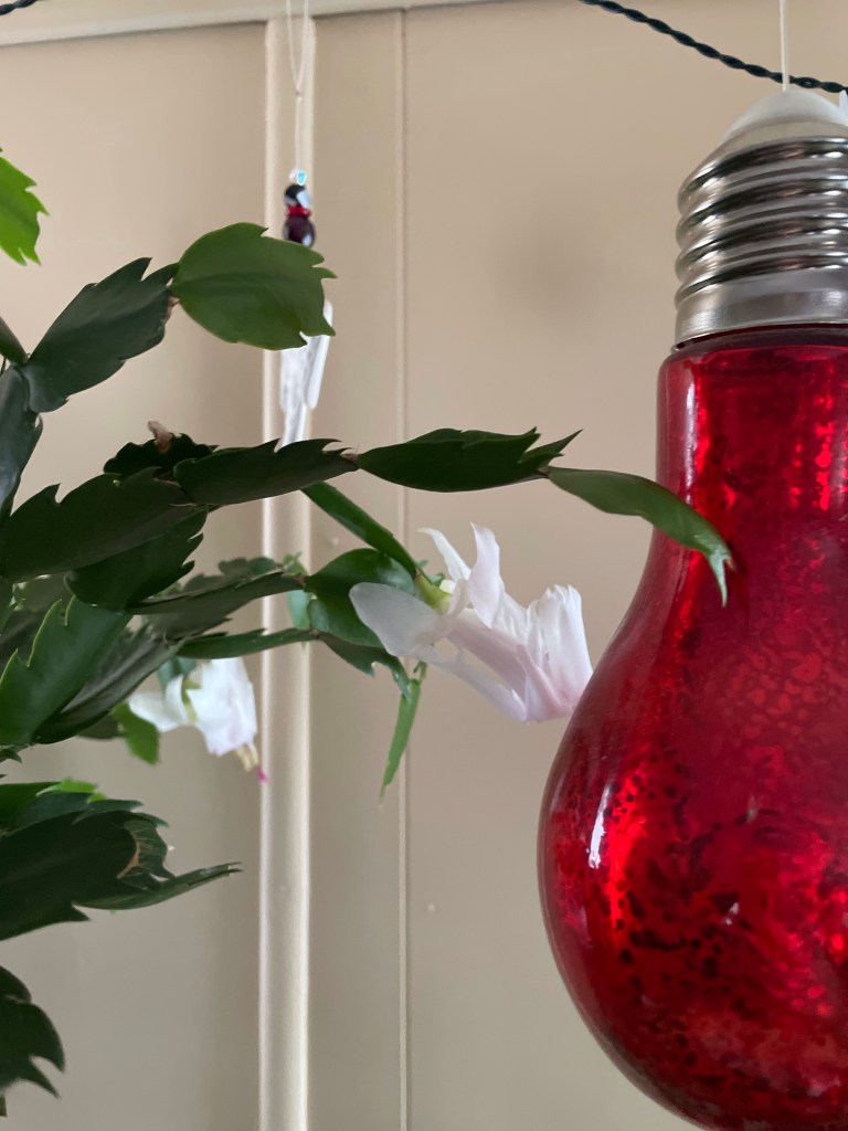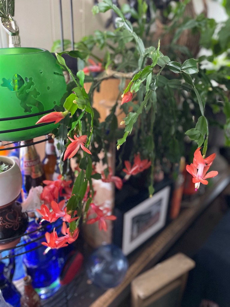My couch had a 5 year warranty which not surprisingly now that it is 6 years old, has issues. It is pleather and has suddenly in the last month started flaking terribly. I couldn’t stand it any more so wrapped it in a single sheet I had. At least it will slow the process. I love this time of year when my Christmas Cacti start to bloom.