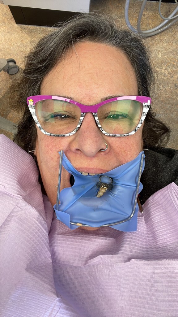 I have had a good day, including another dental appointment. Dr, Mike fixed my food catcher and I took a funny pic to send to a friend who was messaging me while I was there.