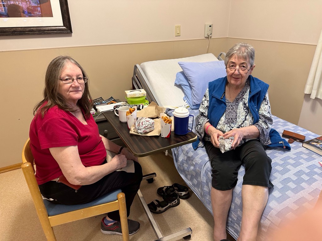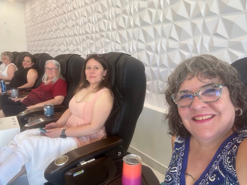 I slept a lovely sleep and enjoyed a bit of a relaxing morning, doing laundry and enjoying my coffee. Will and Sawyer were dropped off before noon to earn a little cash doing yard work. It was completely out of control and between the three of us, we got a lot done including raking, mowing and restringing my fairy lights in the tree. I had them wrapped around the maple tree and worried about its growth. Last year I had them around the willow and it grew fast enough to break the wires in the lights. I look forward to how they will look in the dark. I jumped in the shower and then rushed to drop off the boys and meet Deanne, Rae-Anne and Ashlée at Aivia Nails for pedicures booked by the girls as a gift. I was pleased to drink the ‘coffee’ Ashlée brought for me which was really Rye and Coke and the massage chair was awesome. The whole environment was lovely and a decent price. I would definitely go back. From there we strolled the mall where I picked up a Grandma Shark mug for Tracey and a cute flamingo shirt. Once we left there I went and dropped off all the things from the festival that I had in my car and then picked up Arby’s for Mom and Judy (Roger’s Mom). I found Judy in the dining room drinking coffee and brought her up to Mom’s room for dinner and had a nice visit with the two of them. Final stop was Bill & Deanne’s for a pork roast and scalloped potato dinner with the family. It was nice to sit in a perfect temperature on the deck and visit. Once again I am content and tired, a good combo.