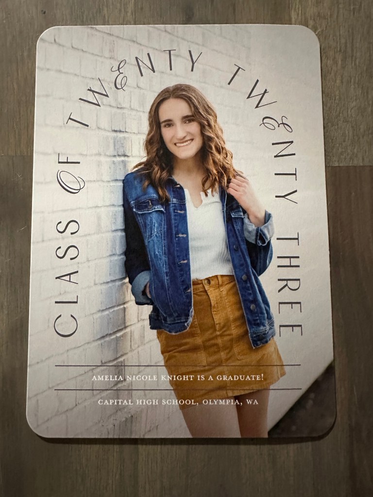I gathered my mail to find a beautiful card announcing and inviting to celebrate the upcoming graduation of my son-in-law’s Sister’s eldest daughter. Her day is more momentous as it is her high school and college graduation! Unfortunately it is mid-June in Olympia Washington and I have to head out 3 weeks later for musicfest. I so appreciate being included and receiving the card with gorgeous pictures and her story. I will show the front but there is personal info on the back. So happy for her bright future!