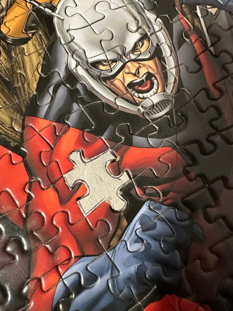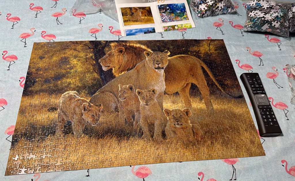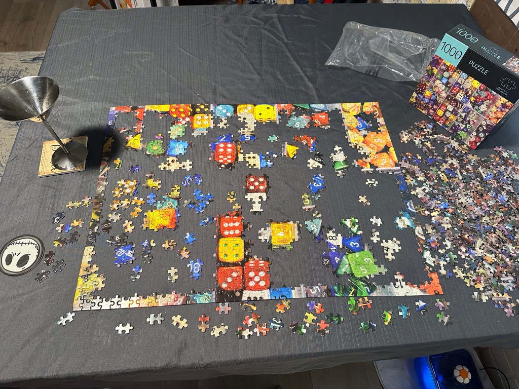 I came home and finished my puzzle… finally! And then I made replacement pieces for my huge puzzle which just need to be coloured so I can glue it as a mat and finally fold down my table as it is in the way.
