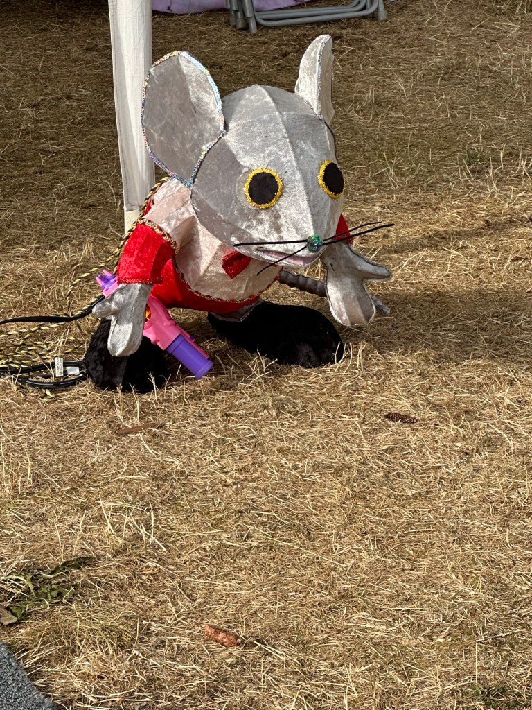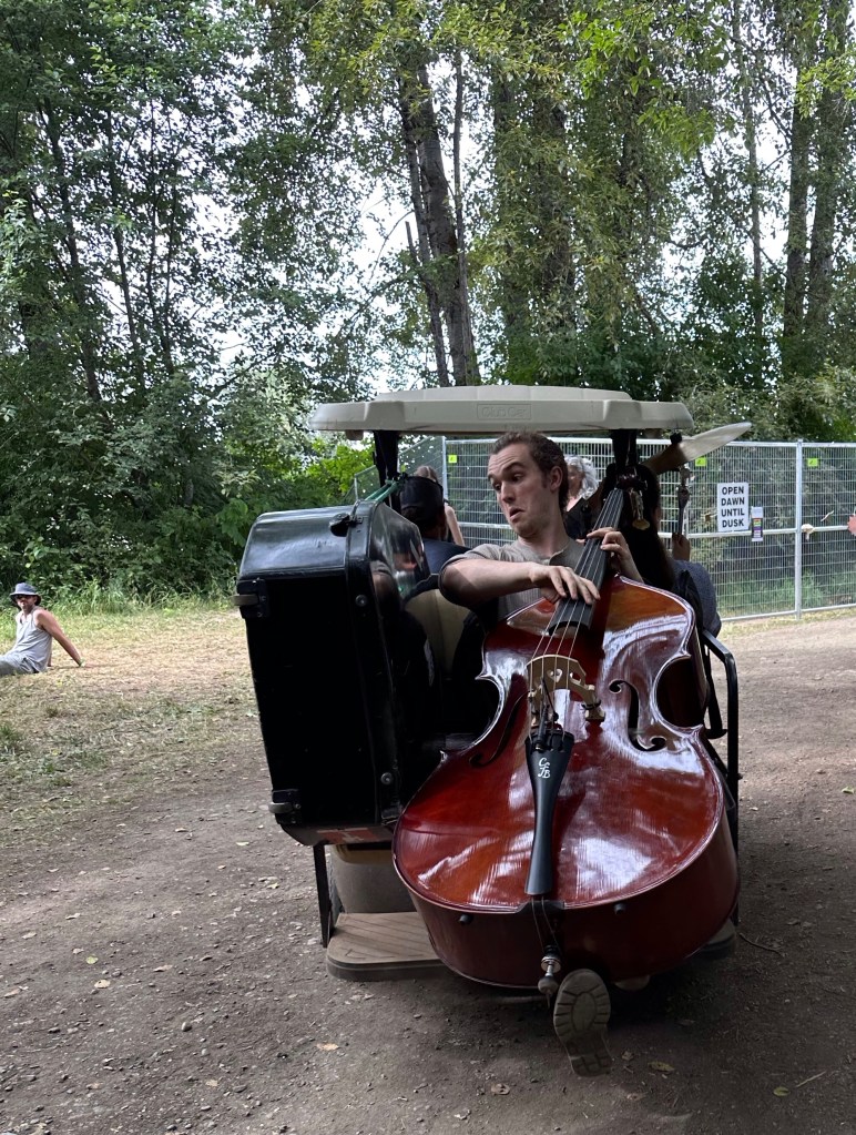 I loved bringing Polky from one stage to another. I had a beautiful woman in Polish headwear and a white dress standing on the back of my cart and ahead of me the stand up bass player accompanied by cymbal played us along through the forest.