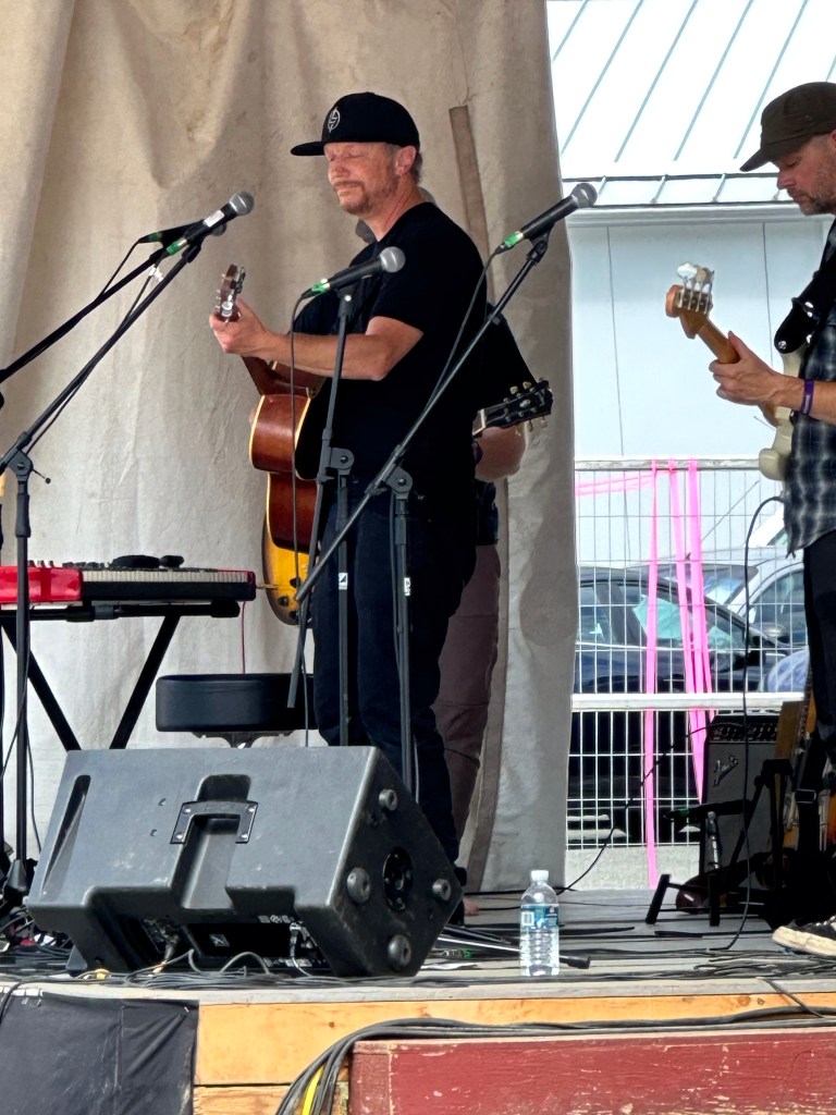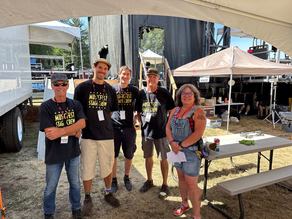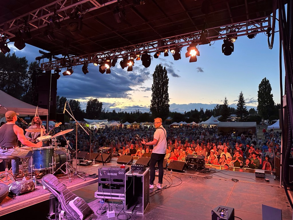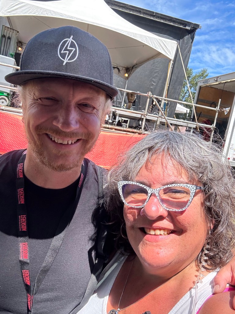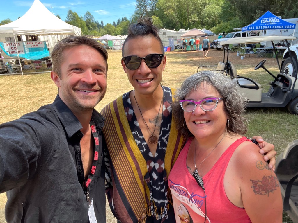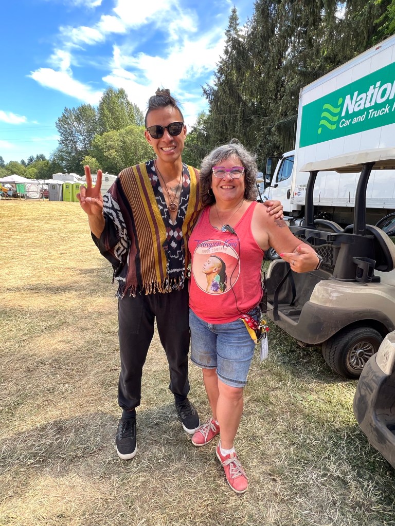 The most important part of my job is keeping the performers happy, or rather, keeping my crew happy, or rather keeping the audience happy… Today was not without its tests but I think overall… mission accomplished. One of my stages had technical difficulties getting going and started 45 minutes late. Poor Tennyson King duo were left standing on stage waiting on the tech. The great thing is that we had them play for our Peak Music Fest last summer in Cranbrook and I bought a tank with Tennyson’s face on it and wore it today. When things were dragging out and some people started to get up to wander away I stepped in front of the stage and told everyone we were sorry but they should stay as I liked these performers so much that I bought the shirt. People laughed and sat down again and I know enjoyed the show. Tennyson insisted on pics with me and a selfie with him and his band mate.