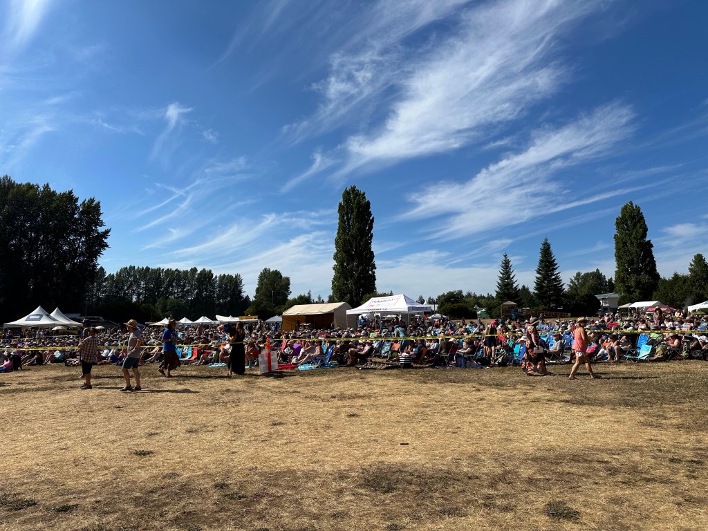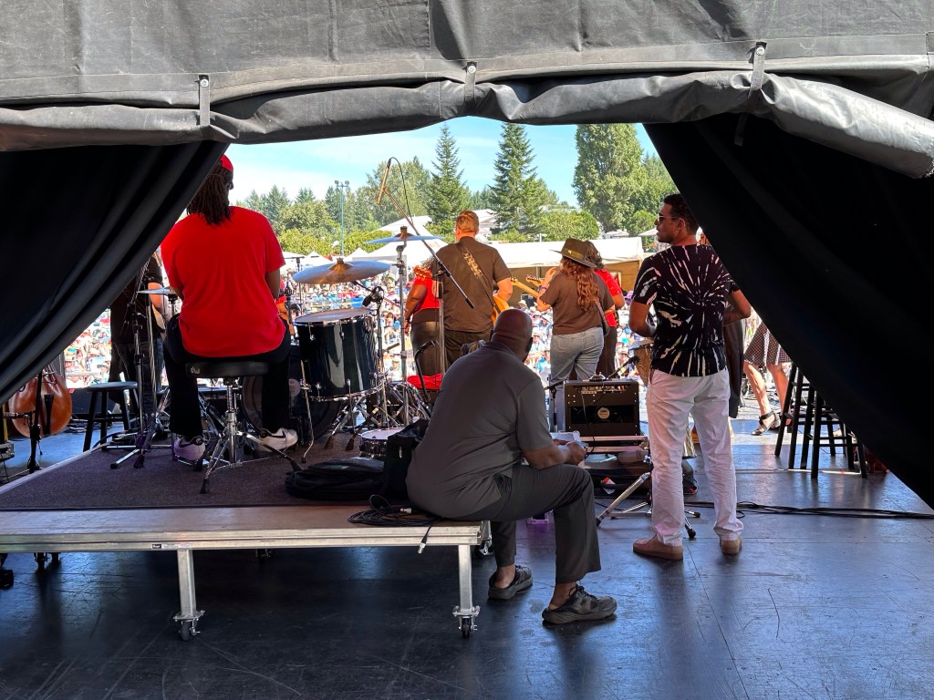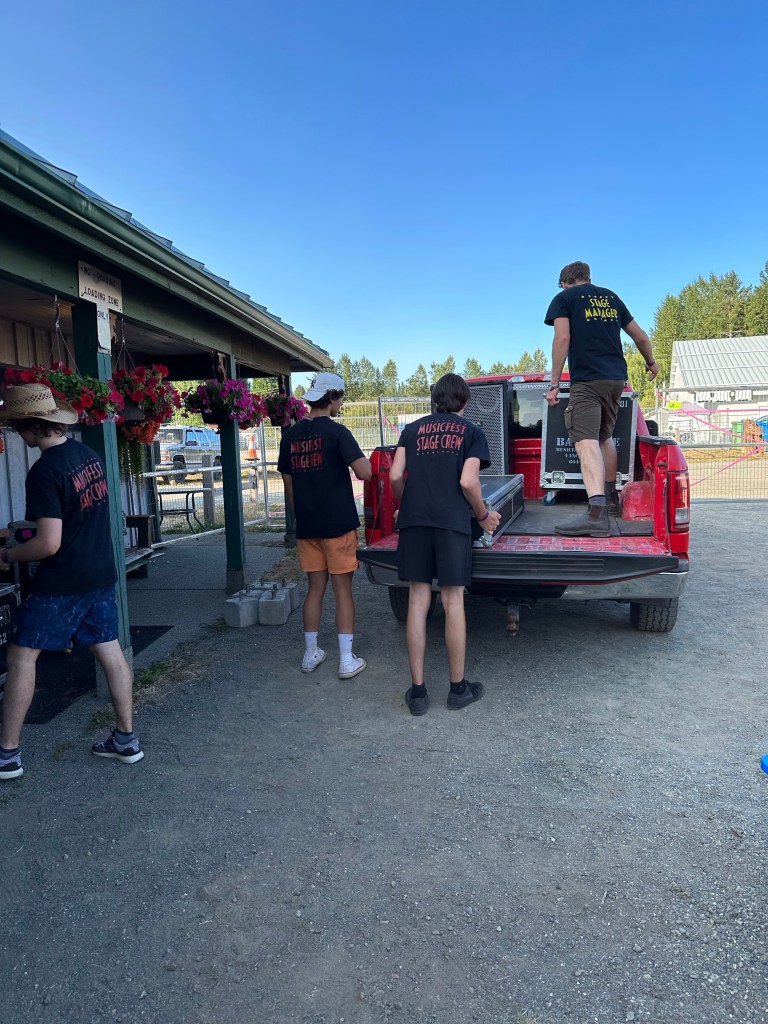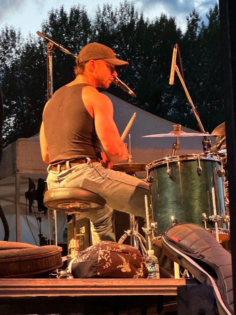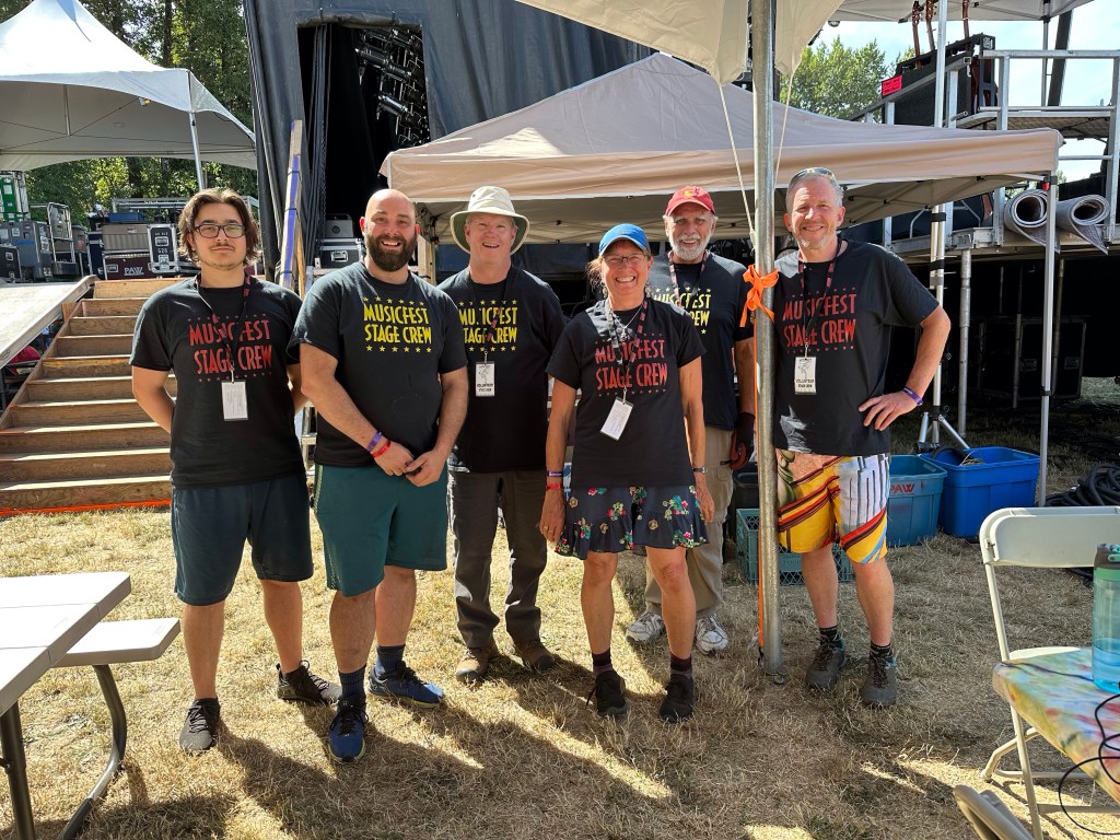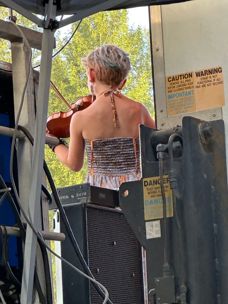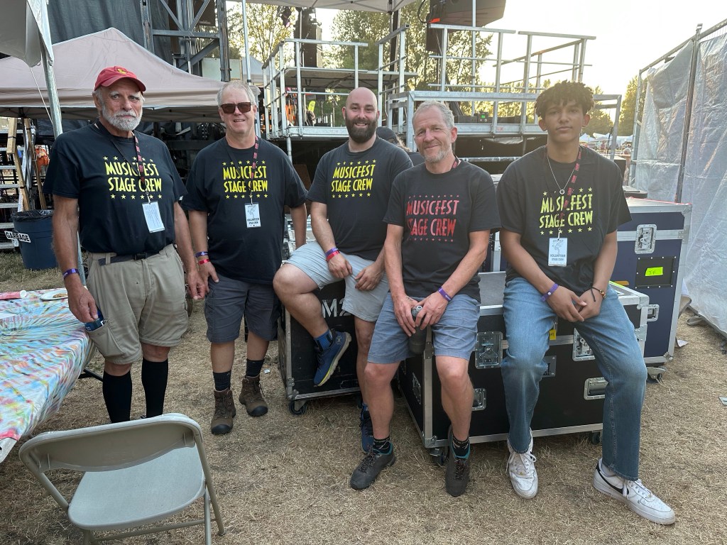 The most important part of my job is keeping the performers happy, or rather, keeping my crew happy, or rather keeping the audience happy… Today was not without its tests but I think overall… mission accomplished. One of my stages had technical difficulties getting going and started 45 minutes late. Poor Tennyson King duo were left standing on stage waiting on the tech. The great thing is that we had them play for our Peak Music Fest last summer in Cranbrook and I bought a tank with Tennyson’s face on it and wore it today. When things were dragging out and some people started to get up to wander away I stepped in front of the stage and told everyone we were sorry but they should stay as I liked these performers so much that I bought the shirt. People laughed and sat down again and I know enjoyed the show. Tennyson insisted on pics with me and a selfie with him and his band mate.