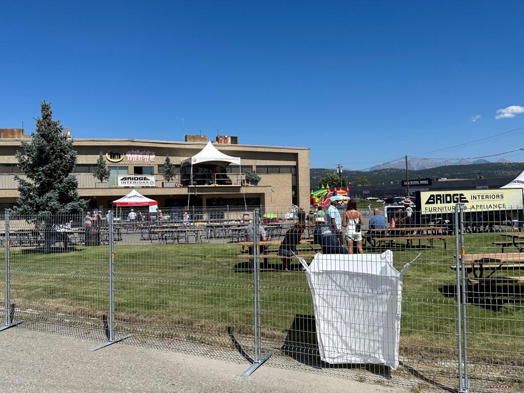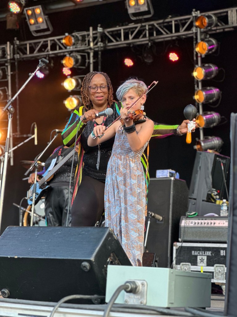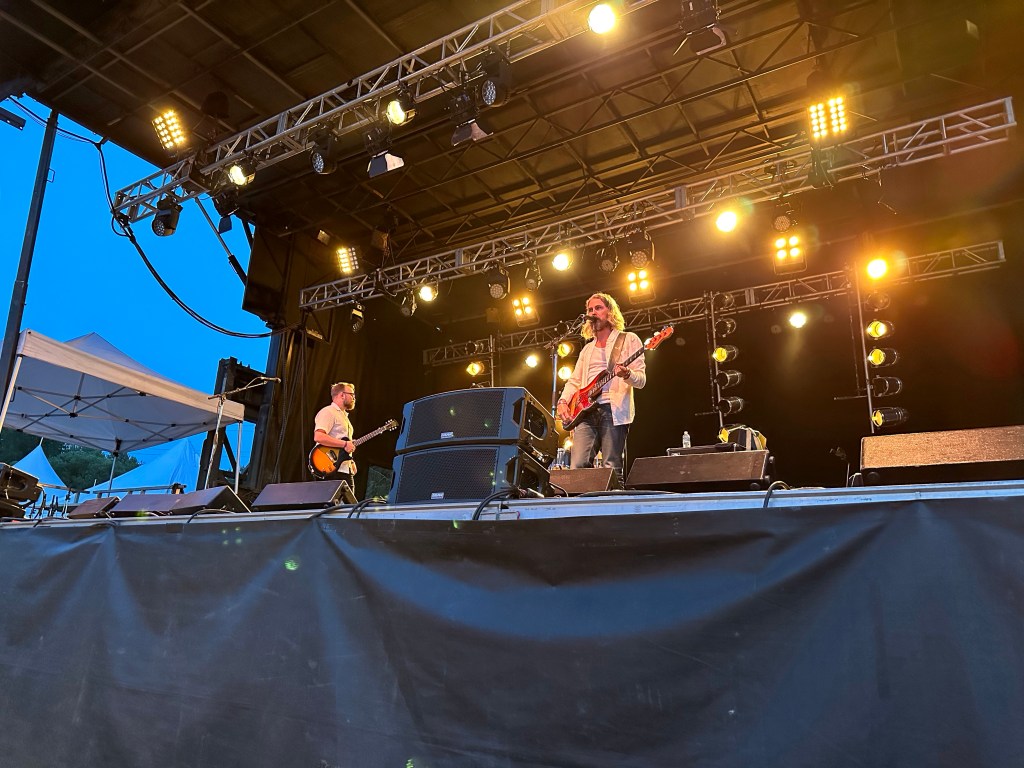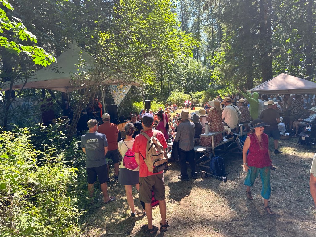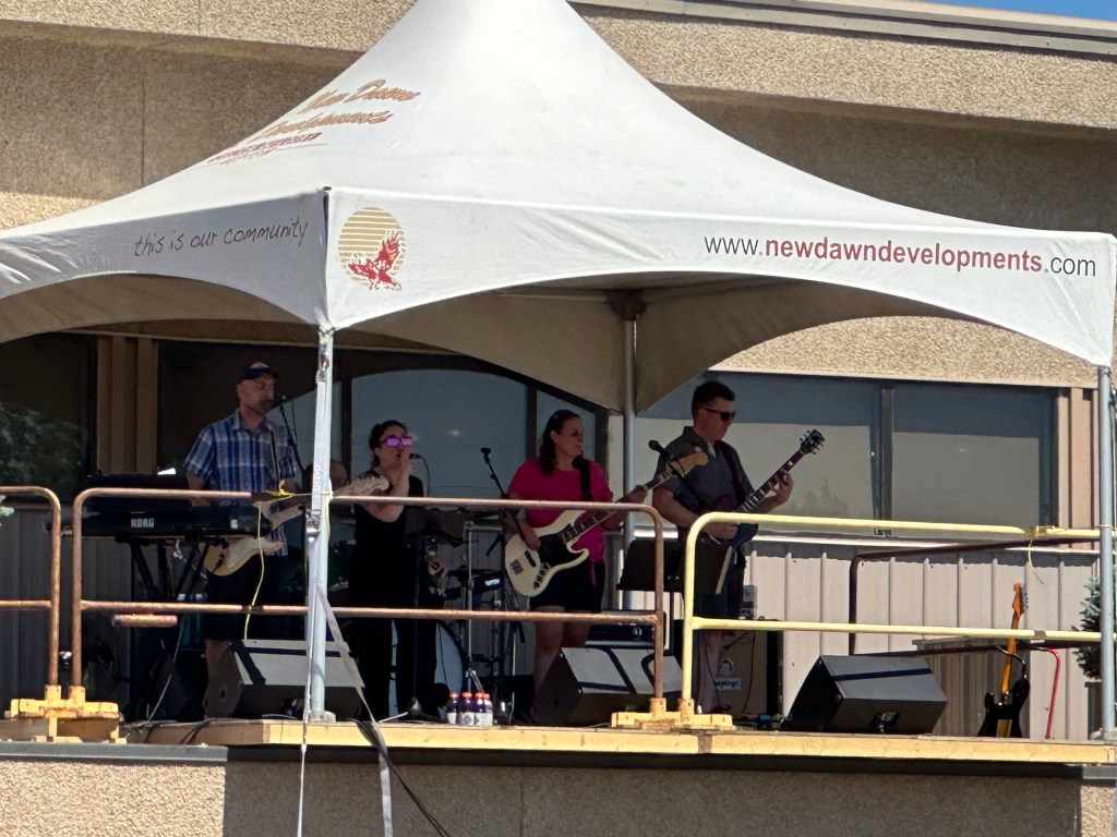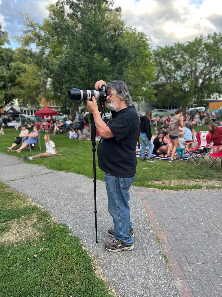 The most important part of my job is keeping the performers happy, or rather, keeping my crew happy, or rather keeping the audience happy… Today was not without its tests but I think overall… mission accomplished. One of my stages had technical difficulties getting going and started 45 minutes late. Poor Tennyson King duo were left standing on stage waiting on the tech. The great thing is that we had them play for our Peak Music Fest last summer in Cranbrook and I bought a tank with Tennyson’s face on it and wore it today. When things were dragging out and some people started to get up to wander away I stepped in front of the stage and told everyone we were sorry but they should stay as I liked these performers so much that I bought the shirt. People laughed and sat down again and I know enjoyed the show. Tennyson insisted on pics with me and a selfie with him and his band mate.