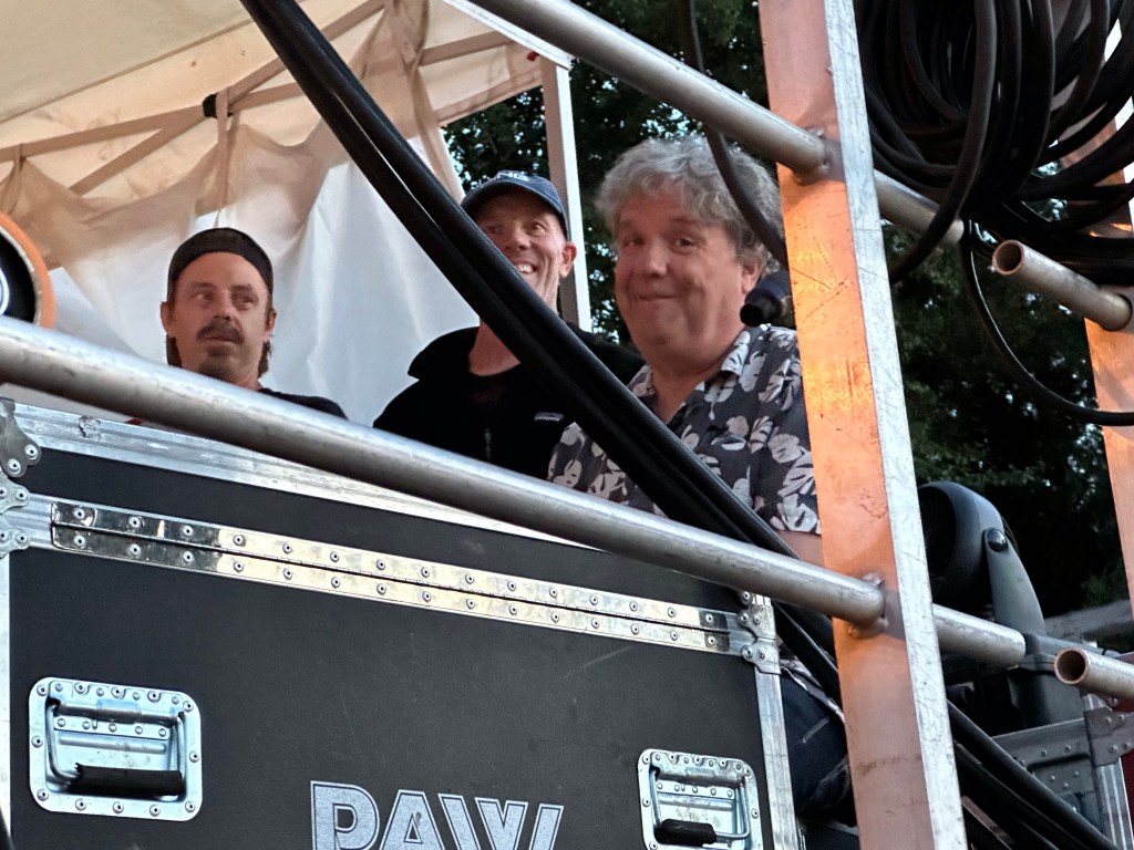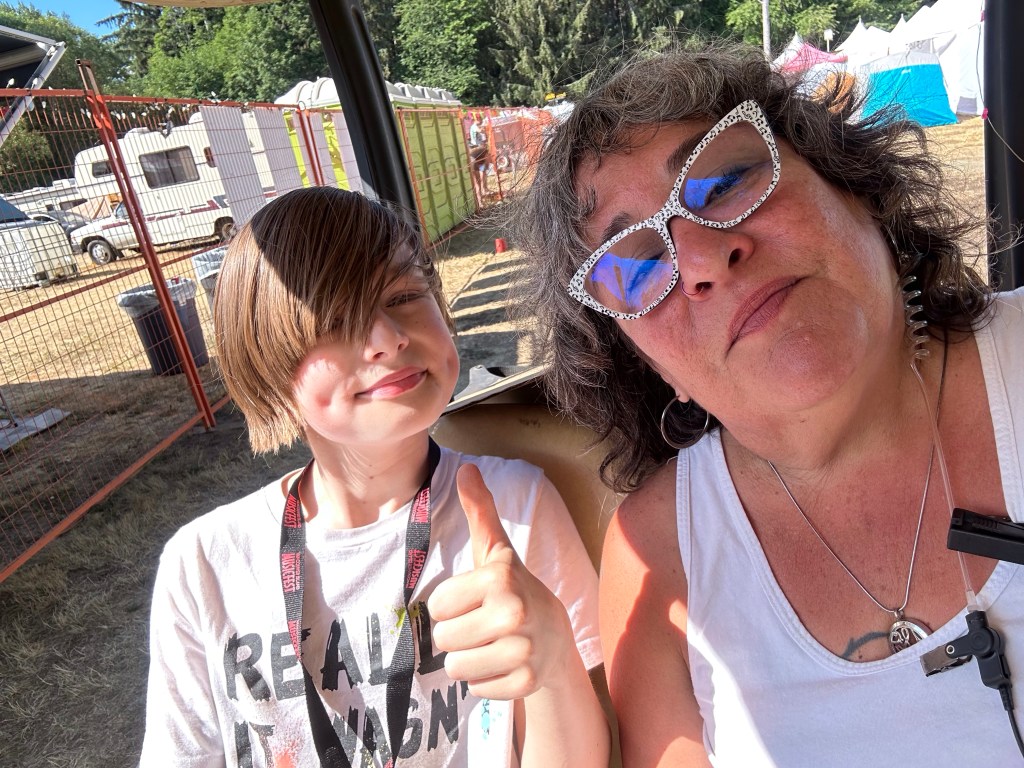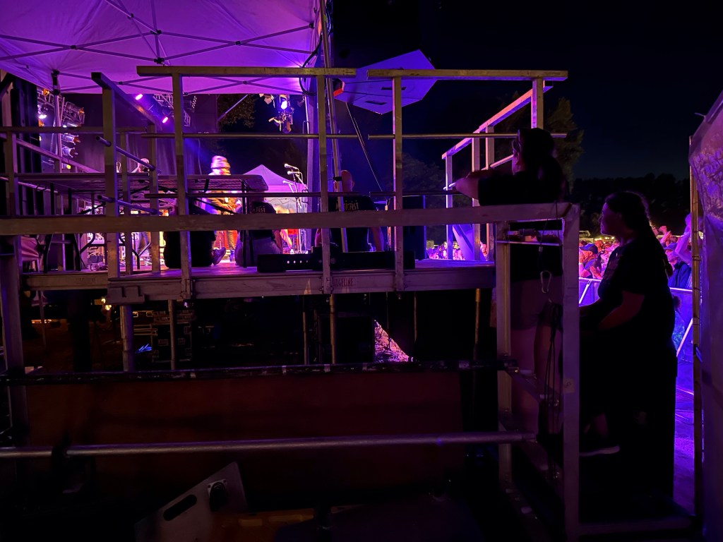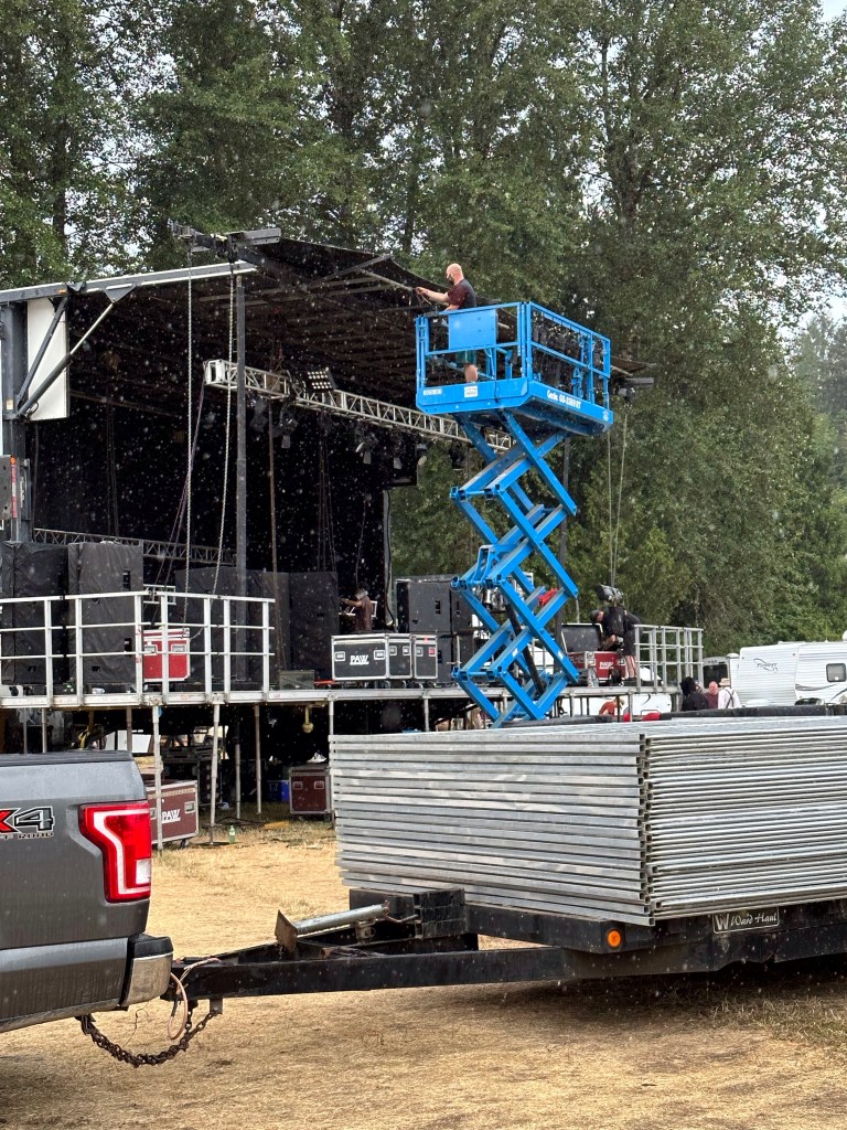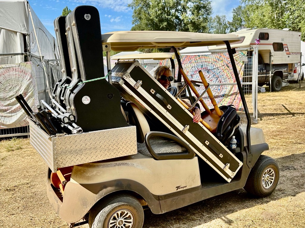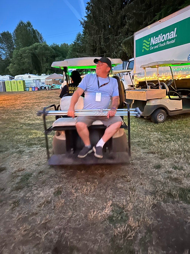 Now it was time to pack up the outer stages. The crew put the gear up and I Tetris mastered it. While I worked on getting it done, I got a radio message from Ashlée that a performer was looking for me and she had sent them towards the parking lot. As I rounded the corner there was a cart with Roy and Lydia in it driven by Jay. Lydia hopped off and told Roy it was me. They insisted on a selfie and we had big hug and promises of hope to see you again