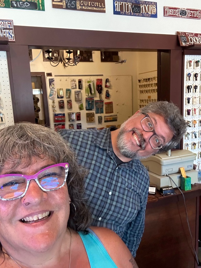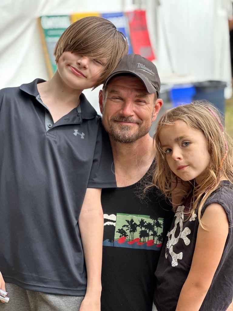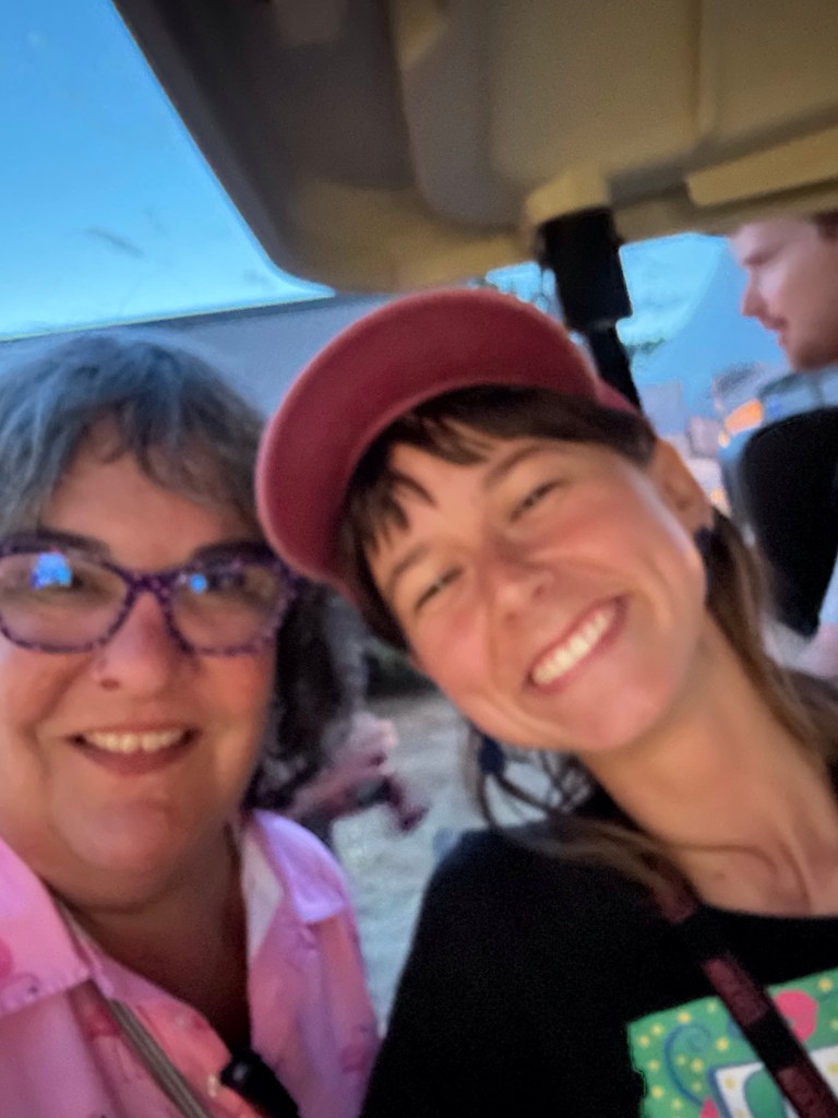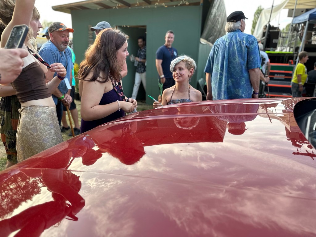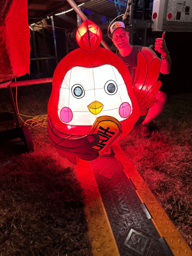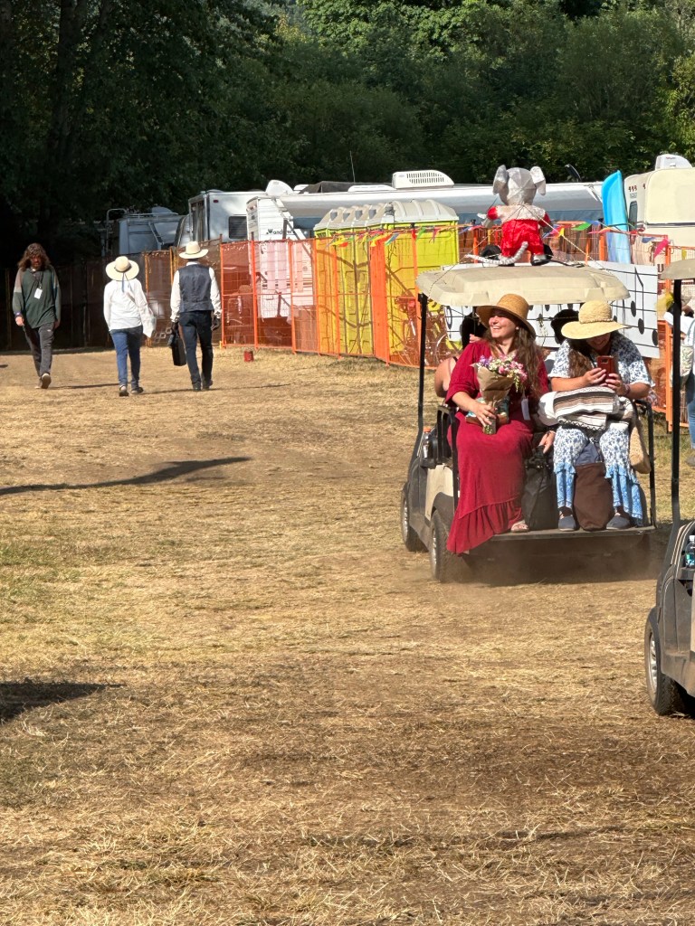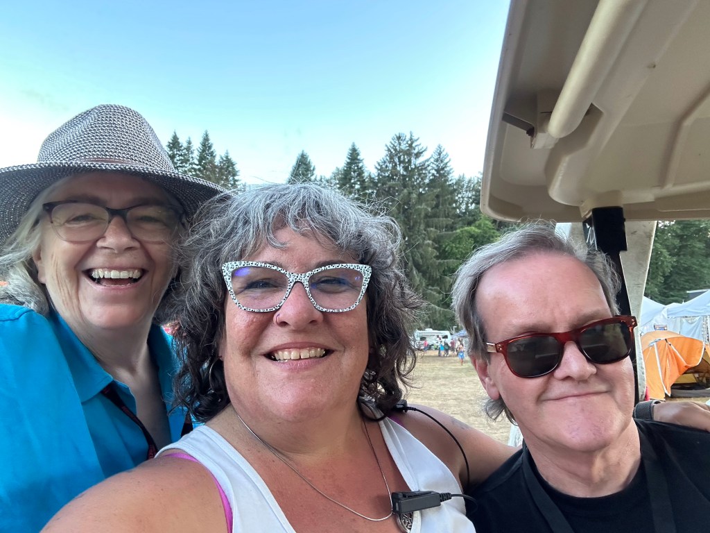 Now it was time to pack up the outer stages. The crew put the gear up and I Tetris mastered it. While I worked on getting it done, I got a radio message from Ashlée that a performer was looking for me and she had sent them towards the parking lot. As I rounded the corner there was a cart with Roy and Lydia in it driven by Jay. Lydia hopped off and told Roy it was me. They insisted on a selfie and we had big hug and promises of hope to see you again