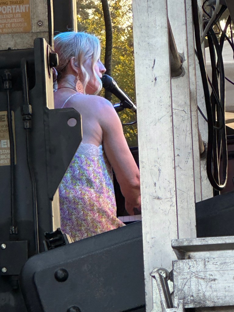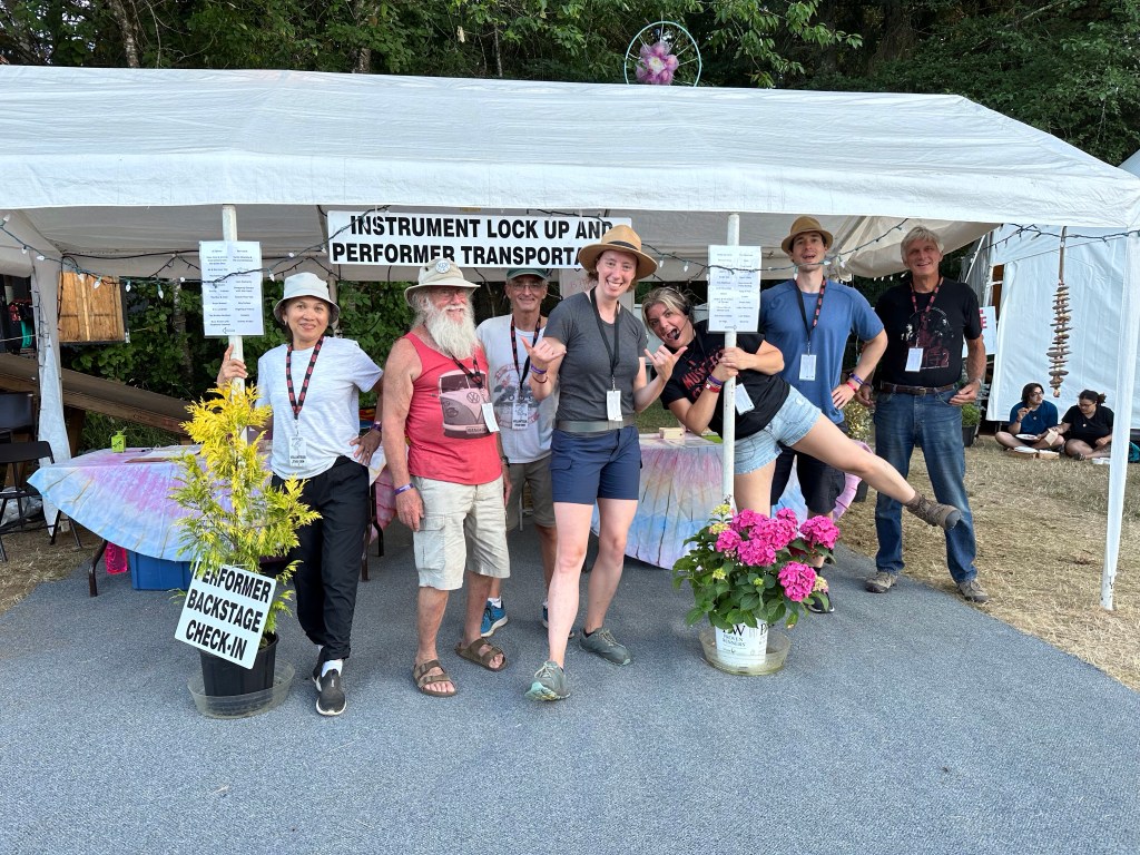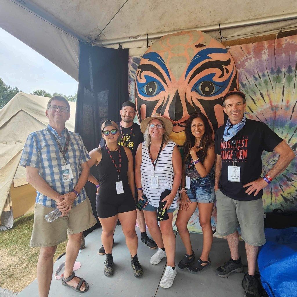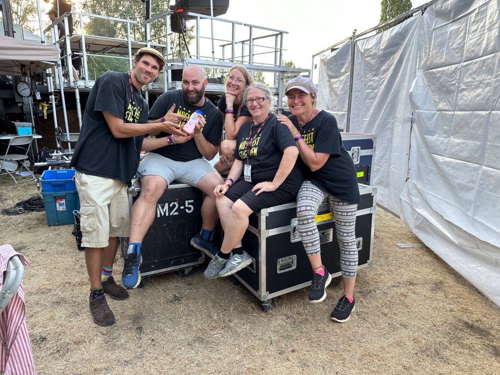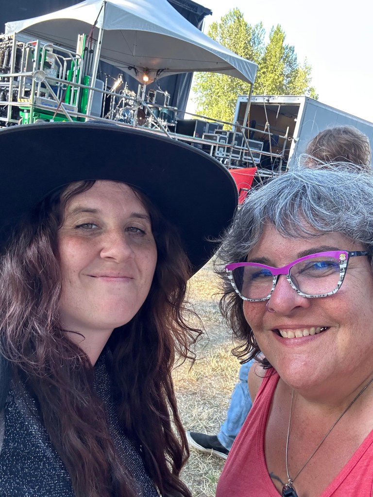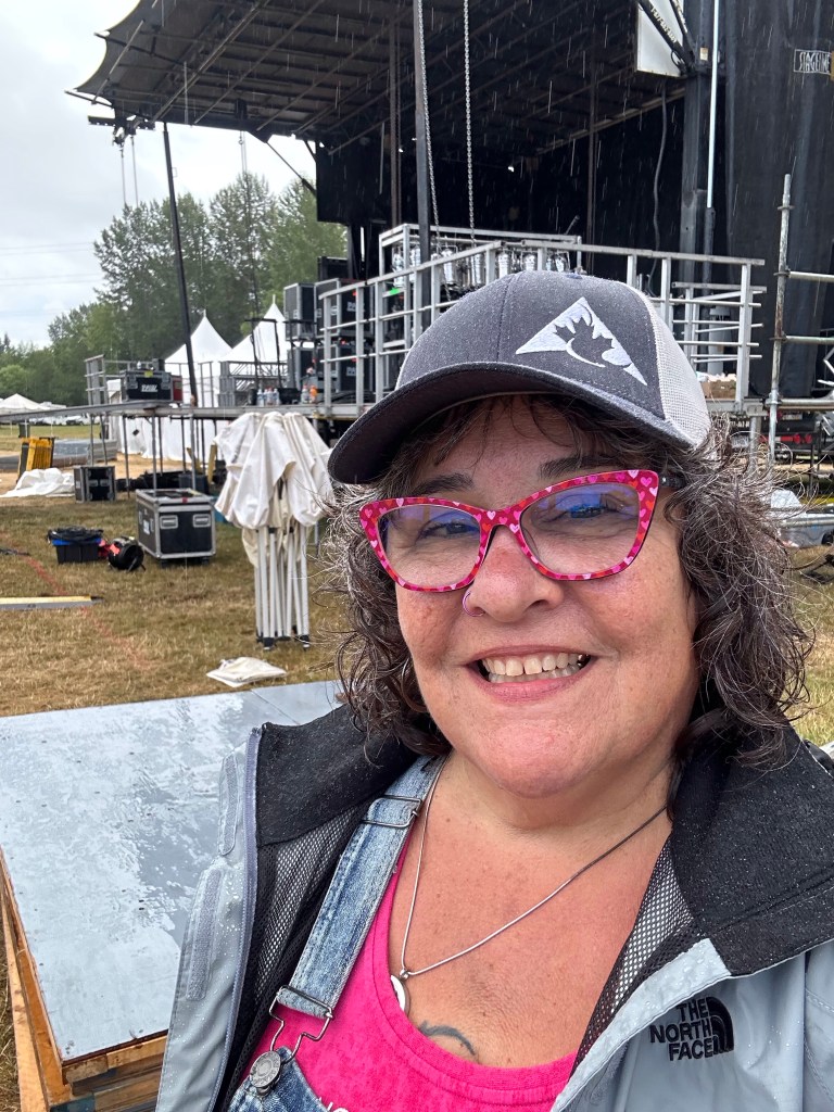 I am so tired that I will apologize right now for terrible grammar and spelling. I was awake at a reasonable time and got myself ready before running the first payroll of the day. It went smoothly so off I went to meet crew and start stocking the stages with gear and supplies. There were definitely challenges in the day but none compared to taking a half hour break to run two more pay and finding issues with the hours of both and their misunderstanding of the Stat and pay so that when I get home I will have to adjust the previous payroll. It ended up taking two hours, argh. The saving grace was that I was listening to Sarah McLachlan do her sound check while I was working and she is a lovely human being. After two trips to first aid for Doug’s son, Devon, who was taking apart a shelf and it let go, hitting him in the voice box causing him to lose his voice and Sound Tech Mike who walked backwards off the stage edge and sprained his ankle, I was ready for some good music and fun. It was so great to get bear hugs from my friends from Salt Spring who are here, Wendy and Kate and Daryl Chonka who is performing tomorrow. I was happy to see Tennyson King arrive and he asked me to get a selfie with him when I see him tomorrow. Nikki D and The Sisters of Thunder brought the house down and even dragged Ashlée on stage for a selfie! I was sorry I missed it as I was covering for her so she could take some pictures. They also brought up a young violinist who is the niece of our security team and she was delightful and brave