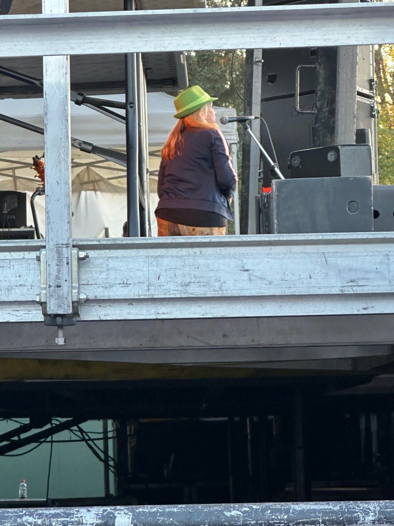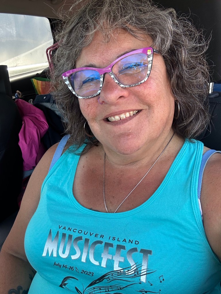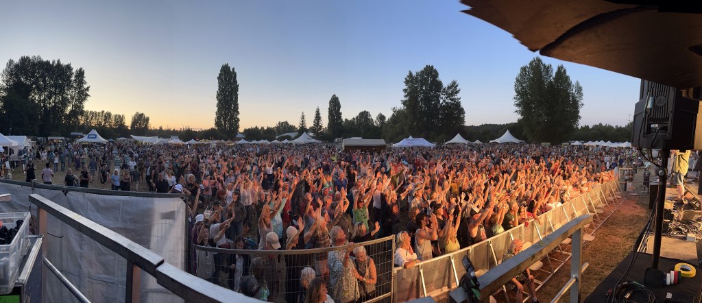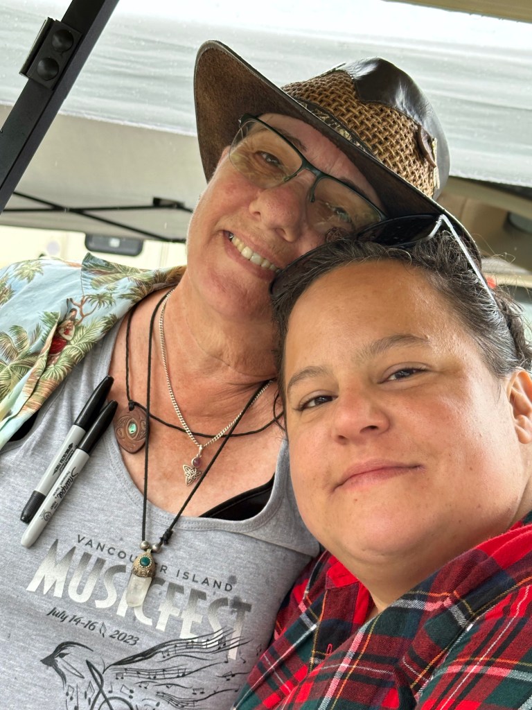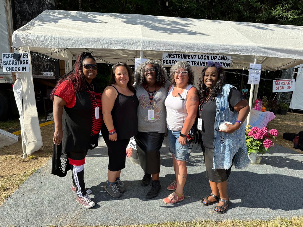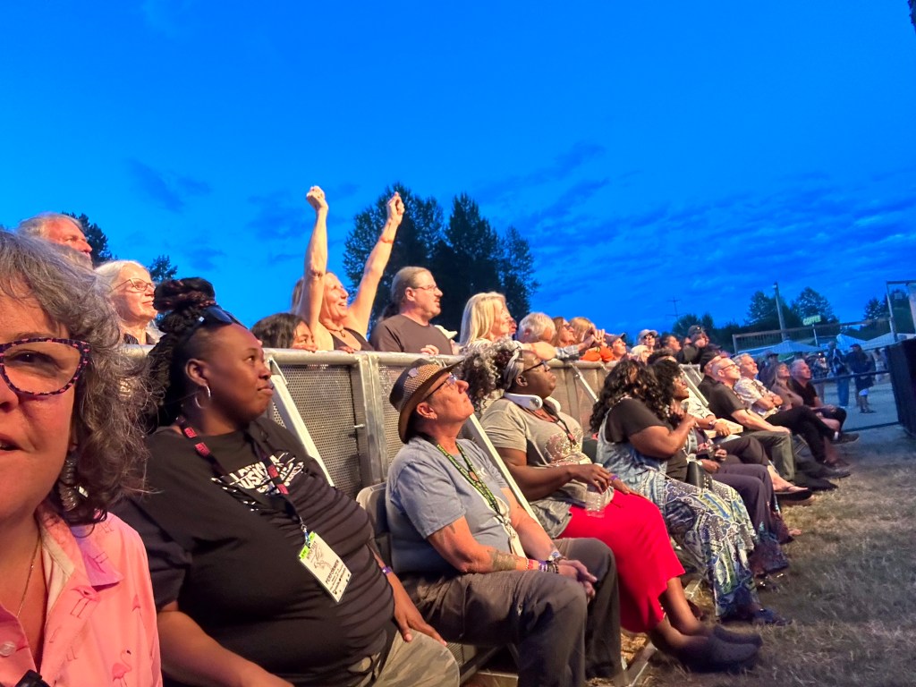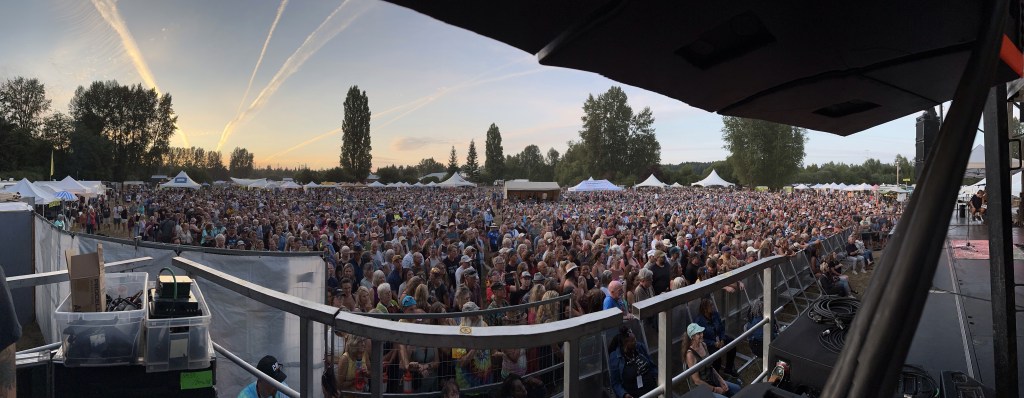 I am so tired that I will apologize right now for terrible grammar and spelling. I was awake at a reasonable time and got myself ready before running the first payroll of the day. It went smoothly so off I went to meet crew and start stocking the stages with gear and supplies. There were definitely challenges in the day but none compared to taking a half hour break to run two more pay and finding issues with the hours of both and their misunderstanding of the Stat and pay so that when I get home I will have to adjust the previous payroll. It ended up taking two hours, argh. The saving grace was that I was listening to Sarah McLachlan do her sound check while I was working and she is a lovely human being. After two trips to first aid for Doug’s son, Devon, who was taking apart a shelf and it let go, hitting him in the voice box causing him to lose his voice and Sound Tech Mike who walked backwards off the stage edge and sprained his ankle, I was ready for some good music and fun. It was so great to get bear hugs from my friends from Salt Spring who are here, Wendy and Kate and Daryl Chonka who is performing tomorrow. I was happy to see Tennyson King arrive and he asked me to get a selfie with him when I see him tomorrow. Nikki D and The Sisters of Thunder brought the house down and even dragged Ashlée on stage for a selfie! I was sorry I missed it as I was covering for her so she could take some pictures. They also brought up a young violinist who is the niece of our security team and she was delightful and brave