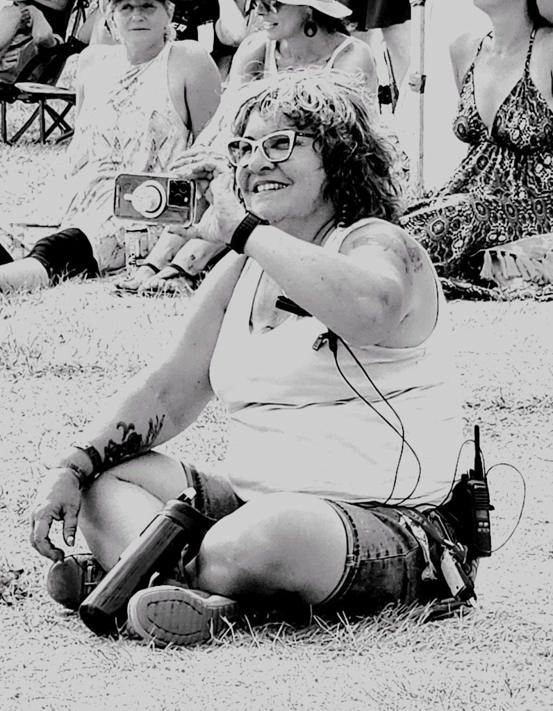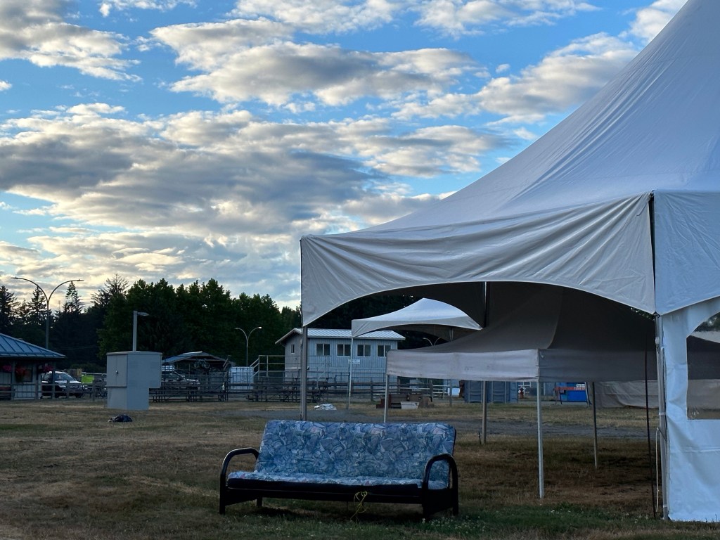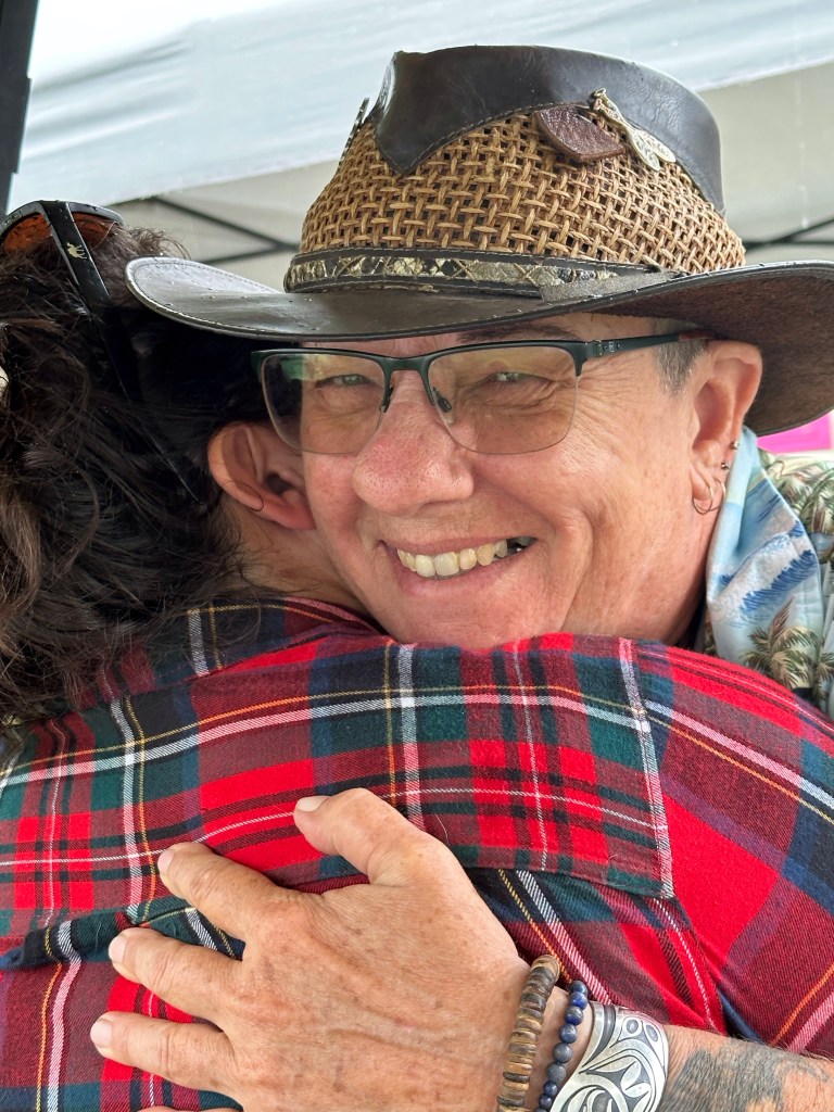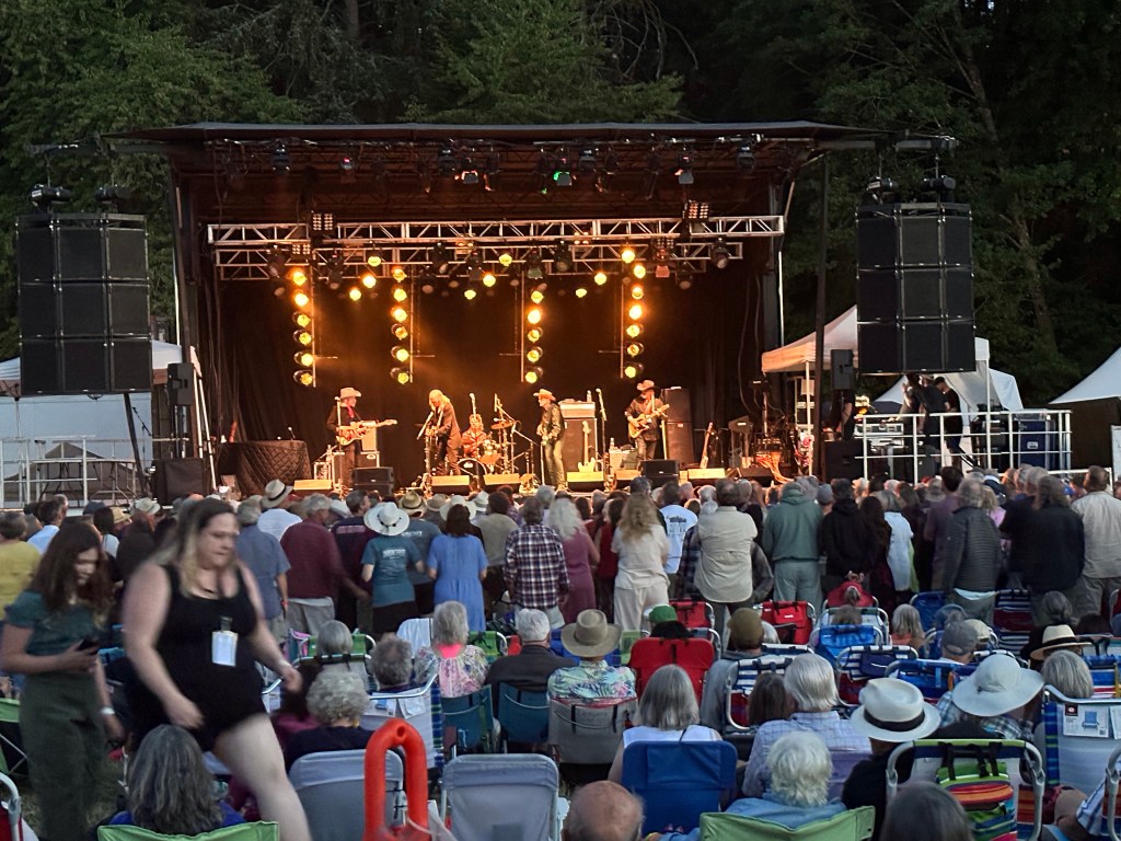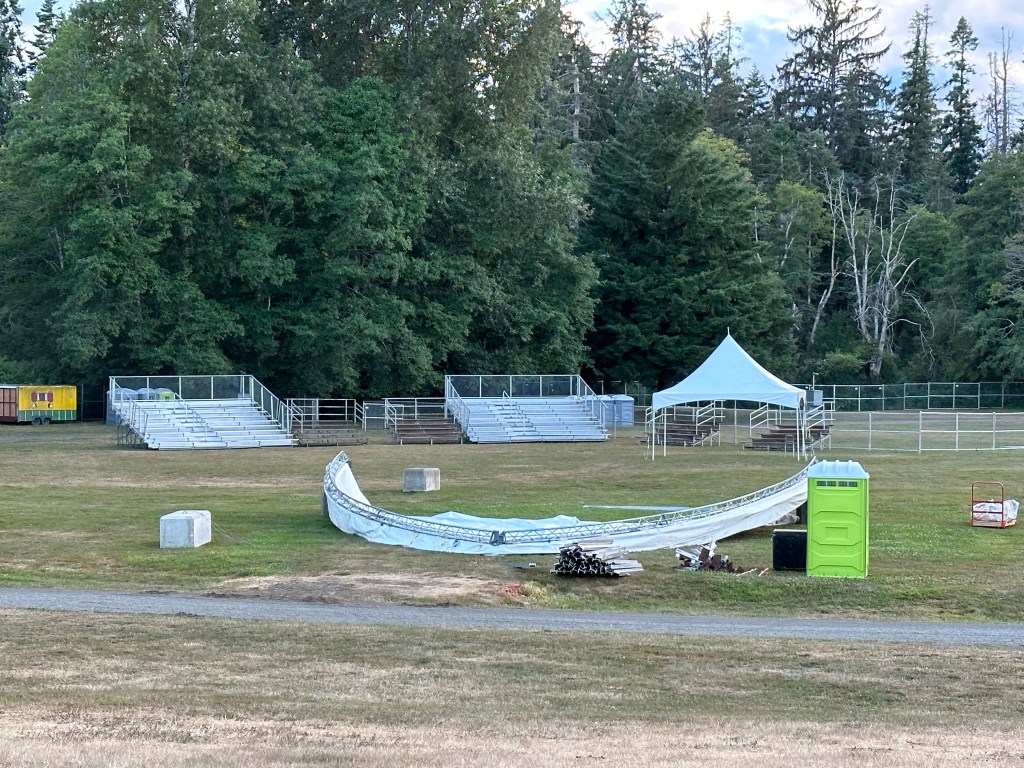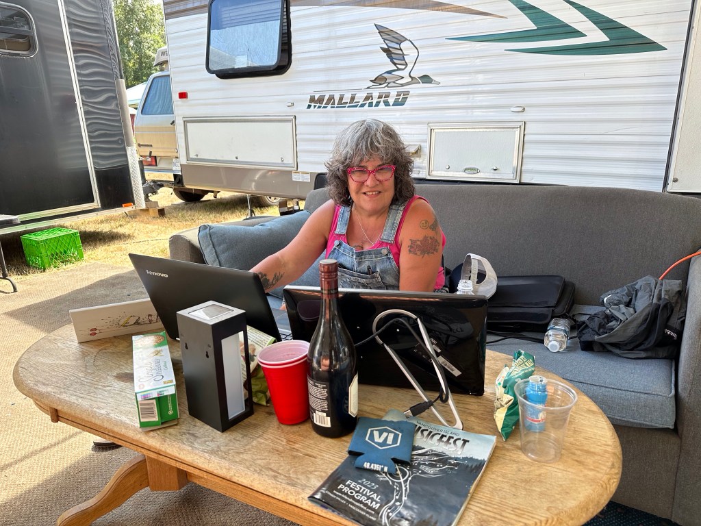 I am so tired that I will apologize right now for terrible grammar and spelling. I was awake at a reasonable time and got myself ready before running the first payroll of the day. It went smoothly so off I went to meet crew and start stocking the stages with gear and supplies. There were definitely challenges in the day but none compared to taking a half hour break to run two more pay and finding issues with the hours of both and their misunderstanding of the Stat and pay so that when I get home I will have to adjust the previous payroll. It ended up taking two hours, argh. The saving grace was that I was listening to Sarah McLachlan do her sound check while I was working and she is a lovely human being. After two trips to first aid for Doug’s son, Devon, who was taking apart a shelf and it let go, hitting him in the voice box causing him to lose his voice and Sound Tech Mike who walked backwards off the stage edge and sprained his ankle, I was ready for some good music and fun. It was so great to get bear hugs from my friends from Salt Spring who are here, Wendy and Kate and Daryl Chonka who is performing tomorrow. I was happy to see Tennyson King arrive and he asked me to get a selfie with him when I see him tomorrow. Nikki D and The Sisters of Thunder brought the house down and even dragged Ashlée on stage for a selfie! I was sorry I missed it as I was covering for her so she could take some pictures. They also brought up a young violinist who is the niece of our security team and she was delightful and brave