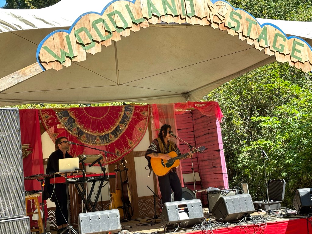 On the way back from there I was thrilled to get the chance to see two of my regular volunteers perform, Jemma Hicken with Daniel Tucker. I jumped out of my cart and took a moment to let the audience know that Jemma stage managed Woodland Stage last year where she was now performing. She told the audience that she had begun volunteering when she was 15 and the crowd cheered