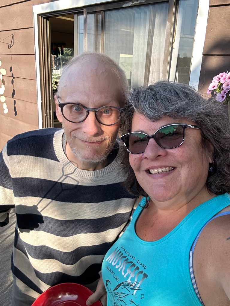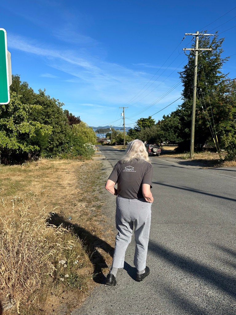 Before even heading to my brothers place, I stopped to visit Donna. She is my step-mother, my Dad’s widow and she has been in Long Term care for a long time now. I send her letters or cards occasionally but this would be my first visit and I did not know what to expect, whether she would even know me and want to visit. She did recognize me, we chatted and then went for a walk. A guy was leaving out a back gate and held it for us so off we went on a good long walk. She was very careful with her placement of feet, keeping to mostly even ground, told me she couldn’t hold on to anything as she could balance better on her own. We looked at plants, she was able to pet and play with two dogs out for a walk with their owners and she stood and stared at the ocean in the distance for some time. All the while, she asked me questions, spouted poetry and song, and seemed very in the moment. I think that it helped that Ashlée had been there the day before. At one point she asked if I had a man in my life. When I said no, that I was happy alone, her response was 100% Donna; Well, Marnée, it’s about time. She mentioned that she had gaps in her brain and I asked her how she knew. I think she knows when words look odd, she asked me twice how old I was and how old she was. She also asked after my Mom and was happy to hear that we are all in Cranbrook together now. I finally guided her back towards the front doors of the hospital where we met a stunned nurse coming back from dinner. She looked very uncomfortable that we were outside and asked how we got the code to get out. It was then that I realized that Sandy, Donna’s representative had made it so Donna wasn’t to go out. This breaks my heart. I shared with the nurses all about our walk and communication. It was hard to say good-bye to Mrs B (the name I have always called her) but we did get a lovely selfie together. I don’t believe she belongs there, in a ward with 3 others. She could be in assisted living or be in her home with a live in helper. I don’t know how Sandy got POA along the way but she won’t communicate to us the reason for her choices in Donna’s care. I do know that if that is my last memory of time spent with Mrs.B, I will always remember the day I inadvertently kidnapped her.