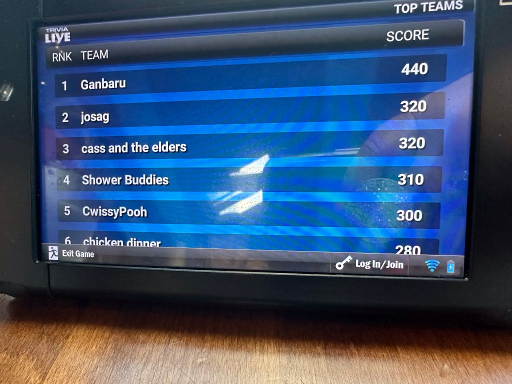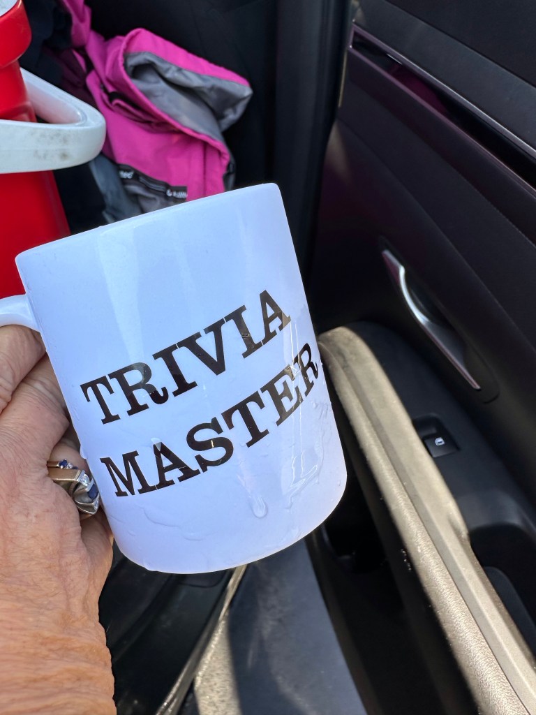 I made it up to Kym and Greg’s and dropped off my stuff just in time for us all to head down to Moby’s for good food and Trivia night. I did get a big hug from Billy Jack. He was a dear friend when I lived there. Our table tied for second for the trivia game and I got to keep the mug and put both our gift card from winning and mine from Christmas against the bill. It was a nice visit but I am definitely peopled out, especially after my visit earlier. Greg and Kym were blown away when I told them how it went. Apparently they haven’t even been able to take her out for dinner, one of her greatest pleasures. I fell into bed exhausted and happy to have spent time with my bro and family