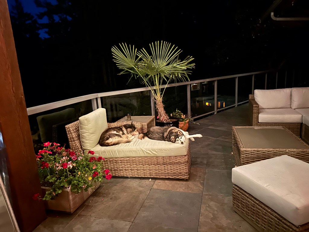 I feel like I had a decent enough sleep but still awoke groggy. I rested on the couch with my coffee and then set off to do some chores. I took out my recycling to a yellow bin, dropped off my refundables at the SPCA, popped into Home Depot to get lag bolts to permanently install my jeeps garage so it doesn’t take flight, and found out the pharmacy is closed Sundays now so I will go tomorrow to get mine and Mom’s prescriptions. I also had a nice, albeit short, visit to catch up with Mom. She is concerned by what she perceives as missing items from her storage and said she is losing sleep over it. I realized after I got home that I think they are in her apartment store room. I will look for them when I bring her prescriptions. We also signed her up for bed changing and laundry service as she is unable and I am not able to commit to that. It is so hot today that I was unable to do much more. I woke with a sore back for some reason and have a headache so I am staying in now (it is 35 C at 6:45pm), ever so grateful for AC. I made a dinner of chicken Satay and Edamame. I feel like going to bed and it isn’t even 7. At least I managed to send out an email to thank the crew and ask for feedback.