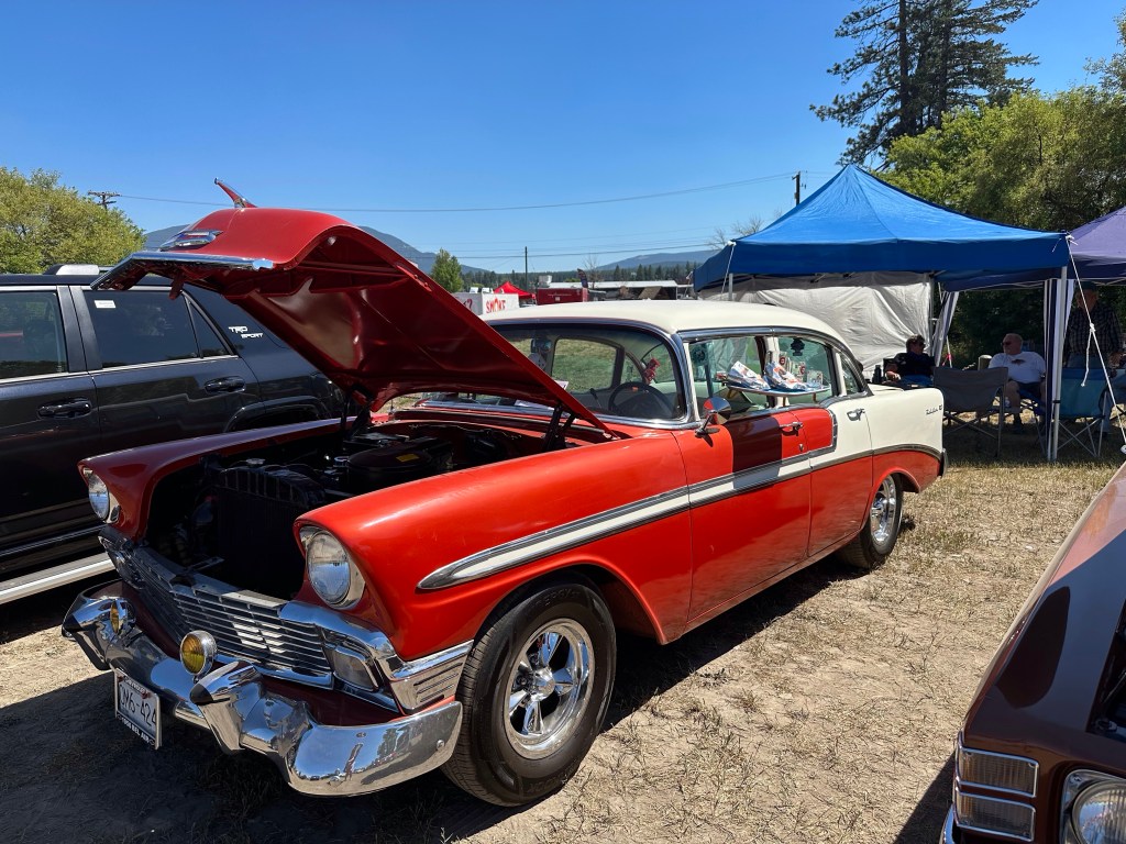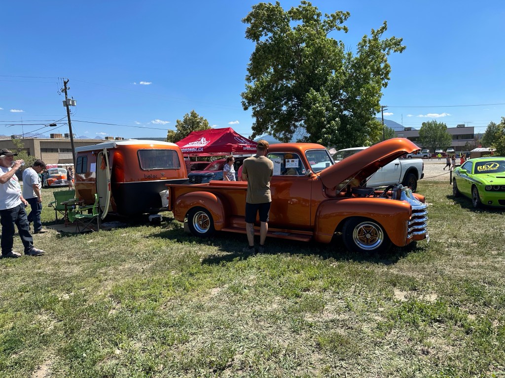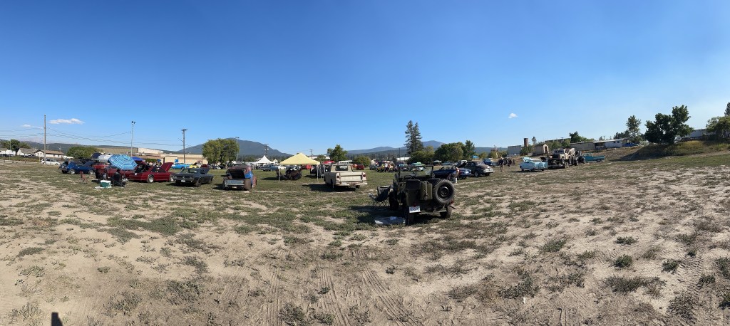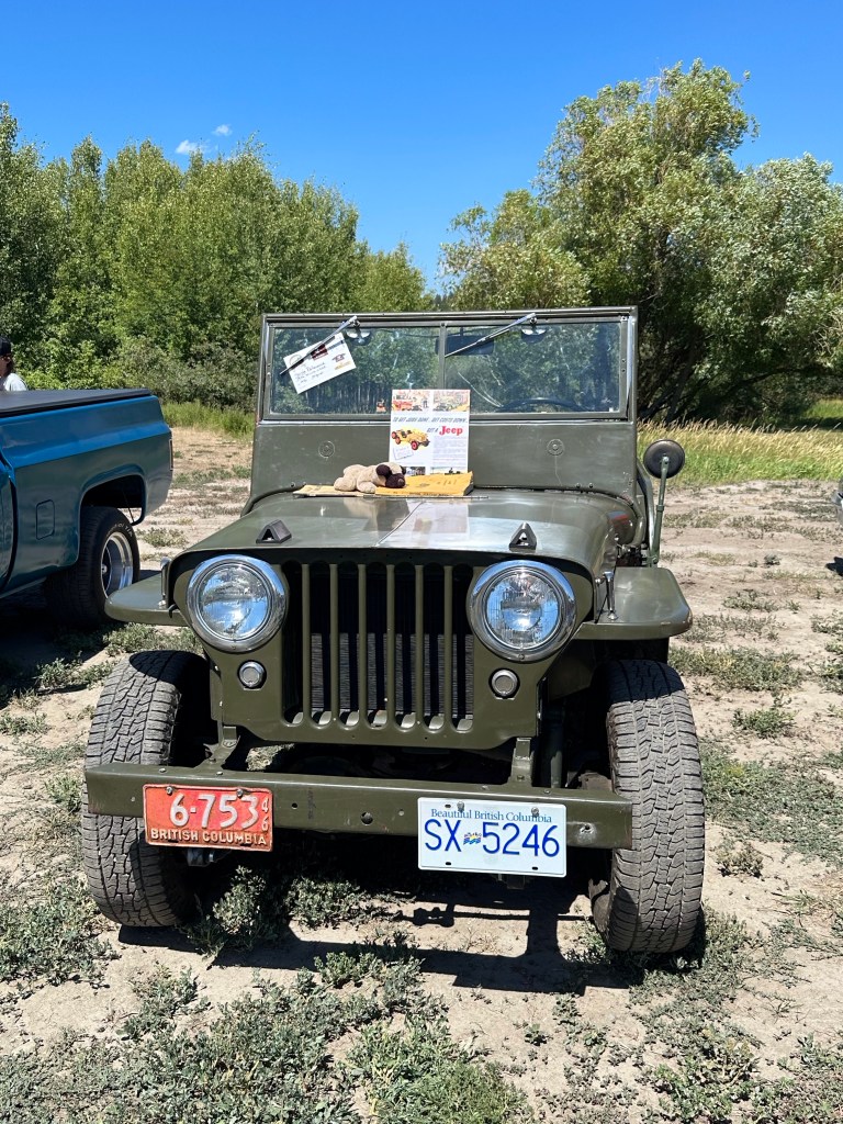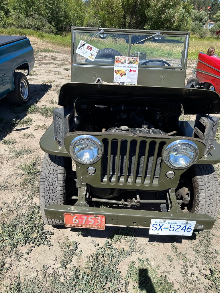 I got myself ready and then went out to wash the Willys and prepare for the car show. The registration said from 11-2 so I showed up just after noon to find the place already full with around 200 cars by my guess. I was very well received pulling into the back row and a few more vehicles arrived after me. It was extremely hot with no natural shade nor water stations. I was grateful for the people who welcomed me to share their shady spots and the great conversations we had. I loved the children who made their Dad’s remember my number to vote for me. There were a few things I would do differently but over all Kenny Bridge put on a great event. I messaged Tracey to come down and we went to the beer garden to join her friends, one of whom, Ray, I had worked with at BC Assessment and we all had a great time. It was a very long day in the sun and dust but there were so many impressive cars and I was glad I was there.