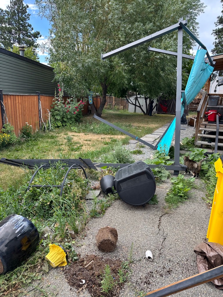 I awoke and called Jake to leave him a happy birthday message. Hard to believe my baby is 29. It was a good long and productive day at the office. I am still weary, but I took the time to print out a message from a performer whom I have known for about 15 years from Salt Spring. I finally headed home, exhausted to find the wind must have been strong today as there was carnage in my yard. The pergola over my jeep, which was tied to the fence blew away and left a mess behind. Amazingly, there is not a new scratch of any kind on the jeep. Will, my 11 year old grandson and his friend Ethan offered to come help me. I went to pick them up and my 13 year old, Lukas was making dinner and fed me. The boys and I with the help of my neighbour moved it to a safer location where I temporarily screwed it down and tied it to the front trellis. The pergola is a little worse for wear but should still keep the weather off the jeep for the summer. I will have to make a plan to get a proper carport for it. I dropped the boys off and was back home by 9, so much for my relaxing evening on the couch!