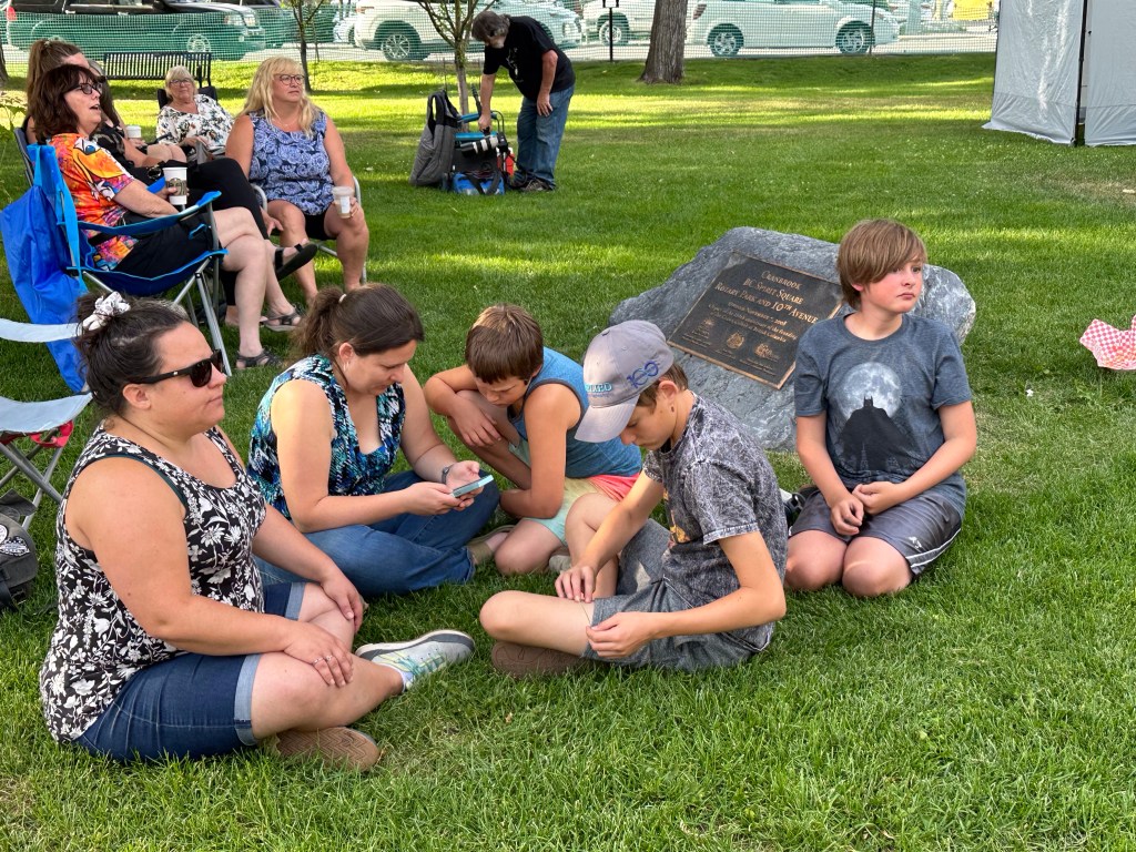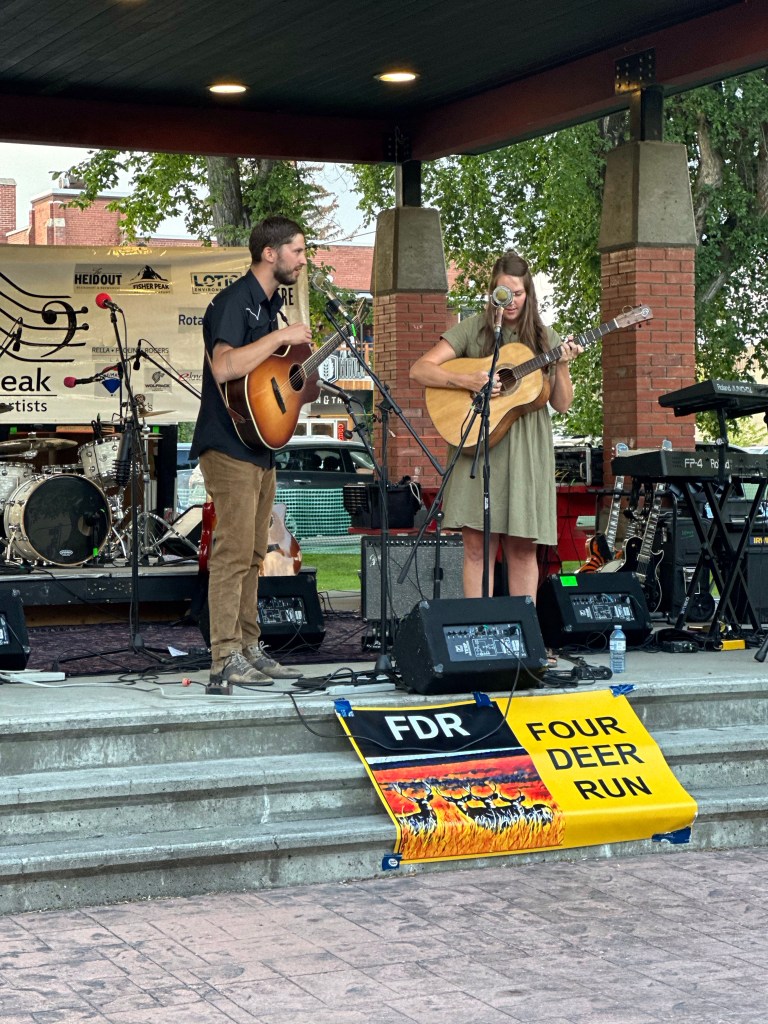 I let myself sleep a bit longer this morning and worked my tail off before heading to the chiropractor where we are, as he puts it, working like molasses to get my spine and neck back to a happy pain free place. Next I was back to the office until it was time to head down to the park to emcee for the final summer sounds of July. It was a good crowd and there were many people who stopped to give positive feedback. Four Deer Run and The Parsons entertained us well. It was nice to just be the emcee and money person for the night. My back is feeling the pain of walking on uneven ground most of the night but it was worth it.