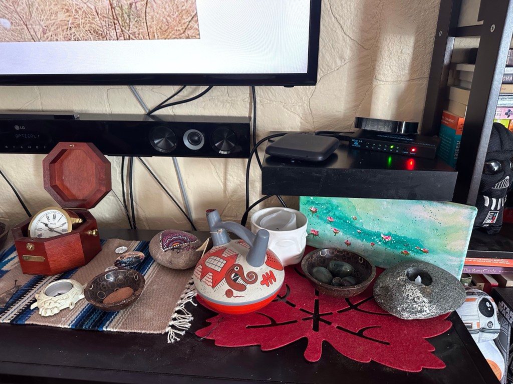 I slept in a bit, then took a long epsom salt and bath bomb bath while I watched the end of Little fires everywhere. I was most disappointed that there is only one season but I enjoyed it. The rest of the day was puttering at some chores, watching shows and reorganizing my living room. I would have had to get up too early to beat the hear and mow the lawn. It is nearly 10 pm and still 24 out, and that’s 10 degrees lower than earlier. I like the new layout in the living room as I can sit in my big chair now to watch and play.
