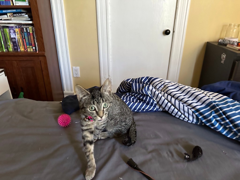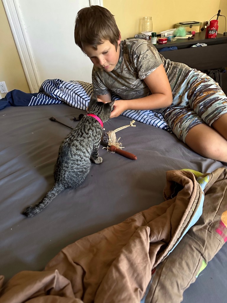The morning brought Nana making pancakes for the boys as they cleaned the house and built a Lego vase for their Mom whose birthday is tomorrow. Once they were done with everything I gave them two hours of screen time while I got ready and brought my stuff home to ready for tonight and get changed into cooler clothes. It was a bonus that I tried a pair of shorts on that I haven’t fit for 3 summers and they are perfect. I brought cat toys to Williams new kitten, Leia. She is so adorable and has a pompon tail as it was stepped on and broken, healing in a curve before he got her.