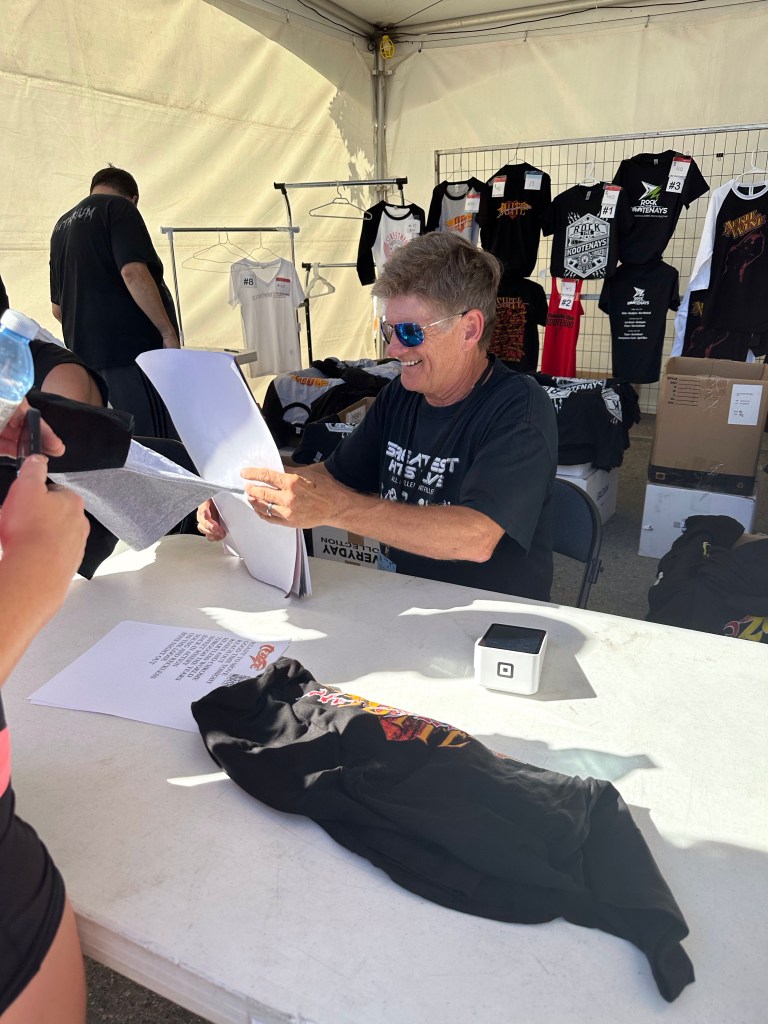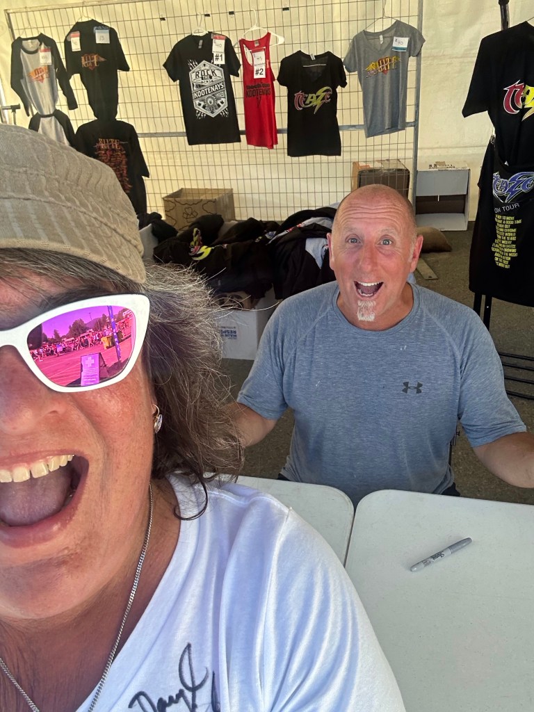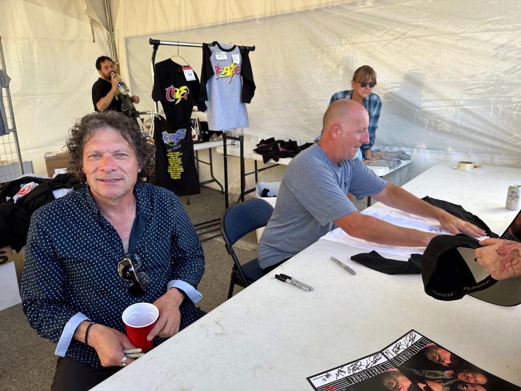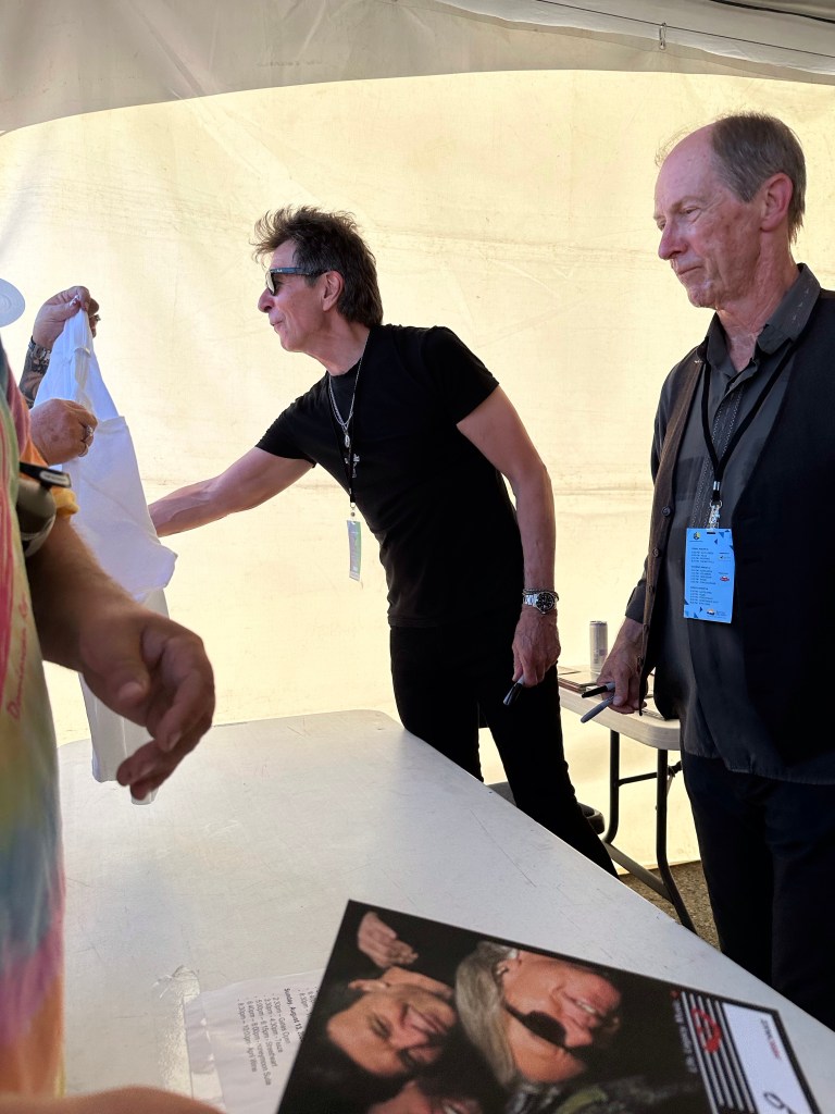 I settled in to watch Streetheart and they were great. I don’t think the lead singer has the chops but he was personable and I enjoyed them. I decided to get in line for autographs on my new shirt and although it was hot standing in the sun waiting for them, it turned out to be one of the fun highlights. They were all lined up behind tables and I had a chat with the first guy about him being class of 74 and moving to Vancouver when he was 20 and the music scene being great there. I got him to sign the back of my shirt. Next was Daryl Gutheil, the keyboardist, who is a founding member of the band. I got him to sign over the heart on the front of the shirt. After him were the drummer and bass player who also signed the back and then last was Paul McNair, the lead singer. When I stepped in front of him, he said: “well, this will be fun!” I promptly turned around and the drummer told him that the front was for founding members only… there was a huge laugh and I got a great picture. He was a very good sport and gave me a cheek to cheek moment as well.
