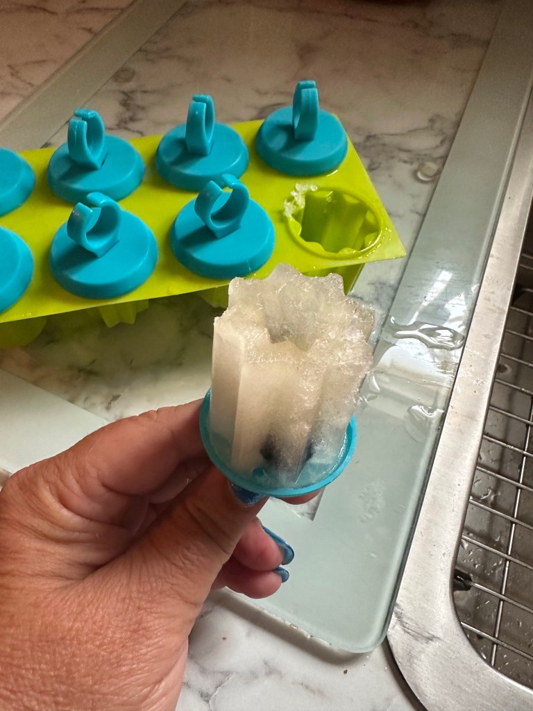 I did have a lovely early lunch with my friend Stacey and we got talking about how to empty more bottles before I go fill them again on Saturday. I looked up wine popsicles and after making dinner, that is what I did. Peach juice, some blueberries and fruity wine for the win. I hope I got the mix right so that they freeze.