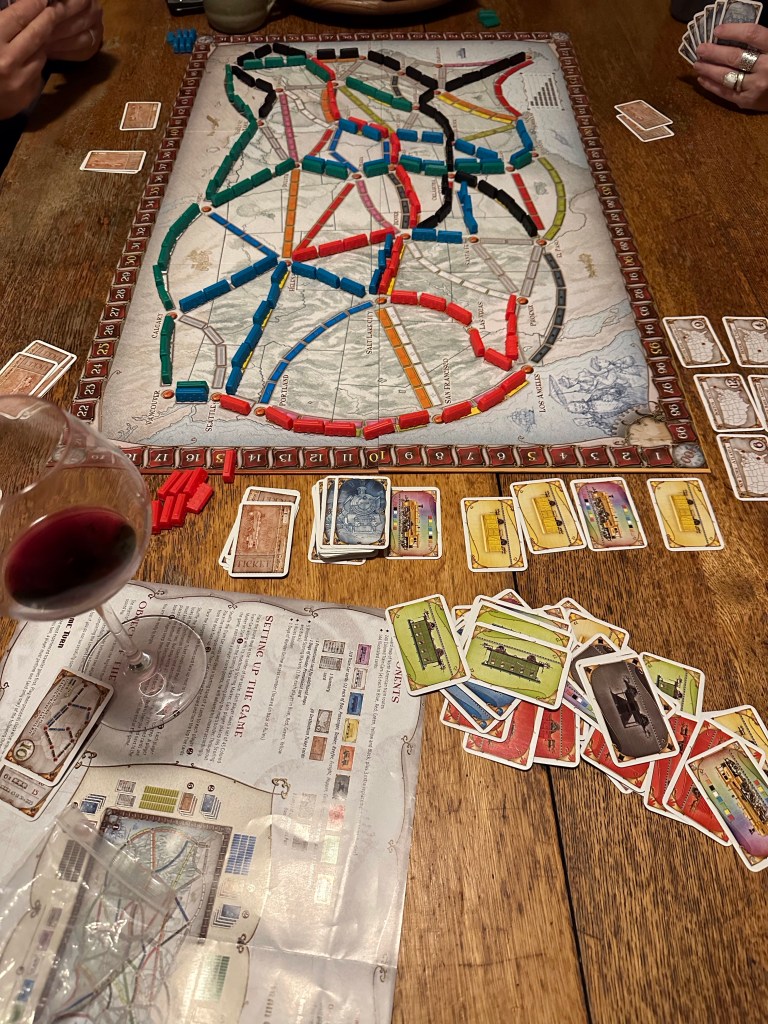 I did a lot of puttering and chores this morning, recycle, litter box, rehanging a coat hanger, and watering my garden. I received a call that my jewelry was ready at Delamont. I had taken a ring to get fixed and another to get sized that Auntie Trish gave me. As I had some spare gold, it only cost me $10 rather than the $90 each. When I was leaving I received a text from Monica to see if I could pick her up to go bottle our wine batches. We had a great time and afterword I dropped my wine at home, picked up salad and dessert and headed to her place. We played 3 games of Patchwork and then had a delicious vegetarian dinner. After dinner Galen, Monica, Zoey and I played ticket to ride, which was new to them. I believe we all had a good time. It was good for my soul.