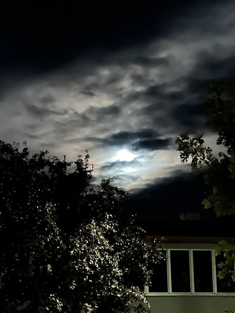 The Super Blue Moon is mostly hidden by cloud cover but it is trying to reflect through.