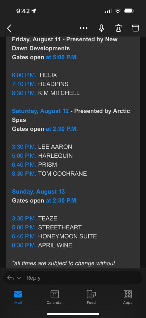 The evening closer was Tom Cochrane, whom I have had the pleasure of seeing several times already. I was glad I stayed though, he put on a great show as always. My phone died half way through a song and I was left to just sit and enjoy.