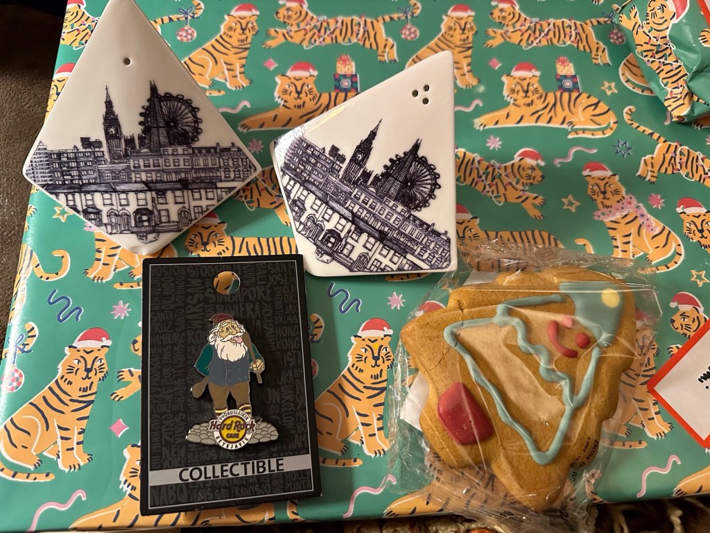 We were all spoiled beyond measure. I was especially moved by a few things including a mug that their neighbour and my friend Addison saw and thought of me, even though we don’t usually swap gifts. There were also cool things from the UK Besties. Hard Rock Reykjavic pin and unique salt and pepper shakers. Roger found some awesome Jack bath bombs, Rae, a wicked fun calendar, Ashlée, some beautiful feather earrings, Jake and Yumi, the perfect puzzle and Danika, a vintage cup set. There was also a perfect shaped mug from Bill and Deanne, and just so much more.