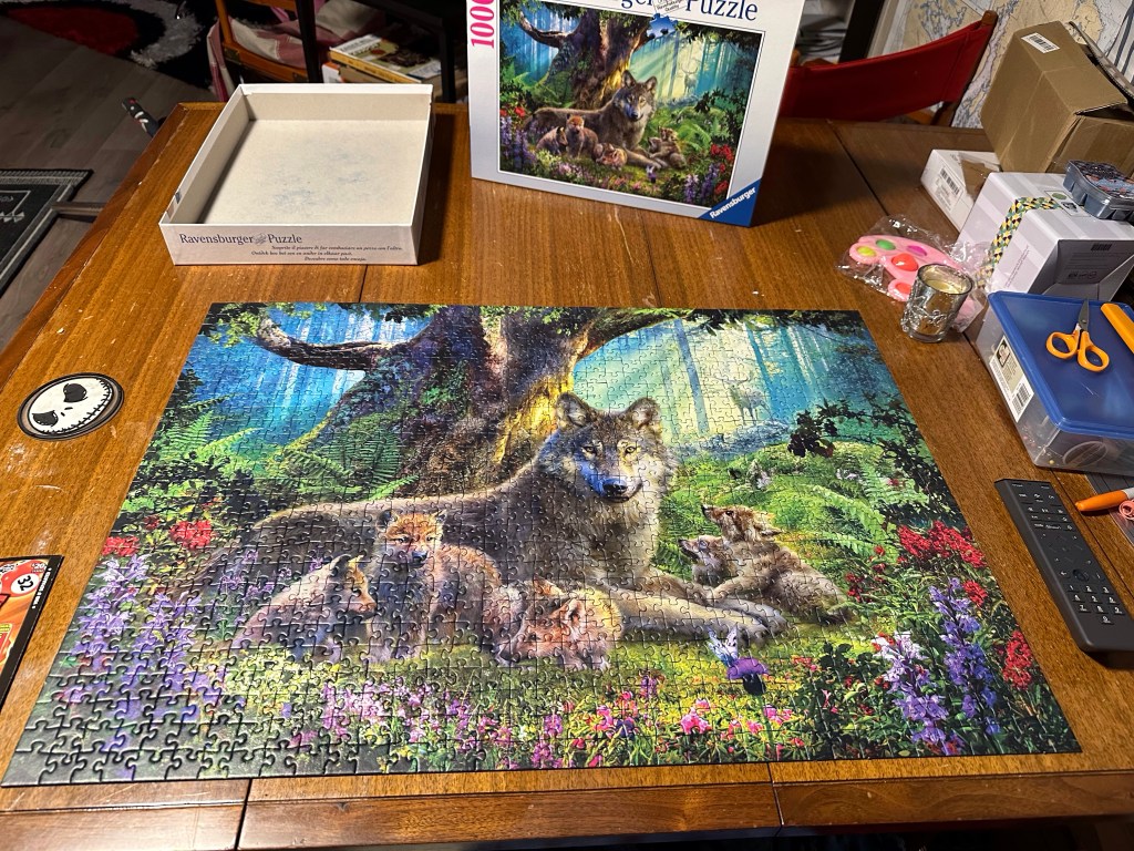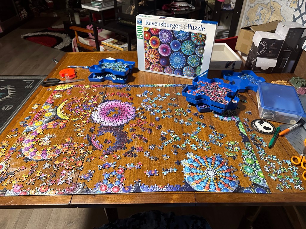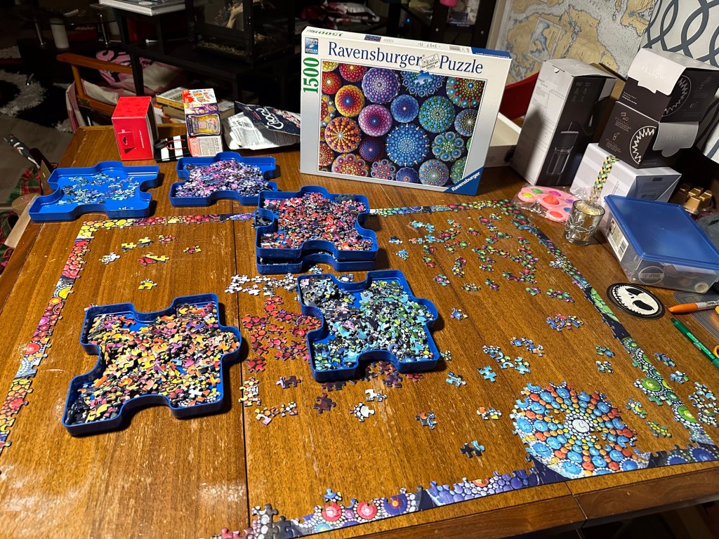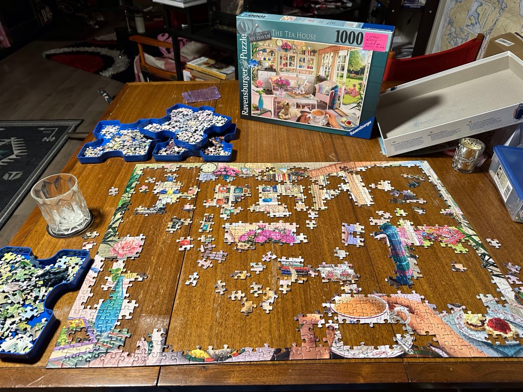 I puzzled before and after picking up mom to take her to the mall for family and friends Santa photo. I also finished watching The Crown and began Fisk, which is an odd Australian show.