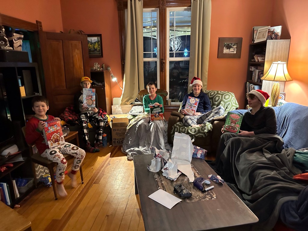 I took Mom home and when I got back, after finding Emmy asleep on the couch and her deciding she didn’t feel well and wanted to be with her mom, I settled into a game of 5 minute Dungeon with Demitri, Emilia, Lukas, Roger and Ashlée. It was fun, but I was fading and decided to come home to sleep tonight. In spite of all the drama, it was a decent Christmas and I will go to the office tomorrow before meeting everyone at Encore at 3 and then of to the Bungay Bash after 6. I look forward to no alarm.. or noise and Missy seems happy that I am home.
