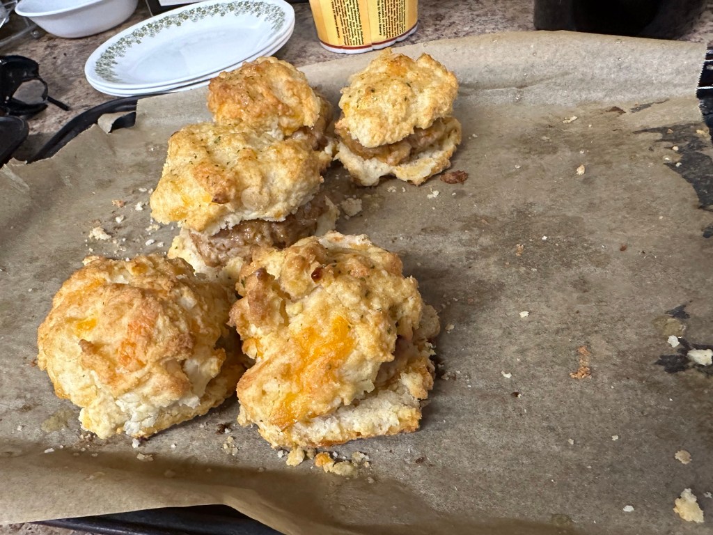 I made breakfast of pork sliders which were mixed with shredded gala apples and topped with a mixture of BBQ sauce and maple syrup and cheddar cheese served in a Red Lobster biscuit. It was a hit, phew!