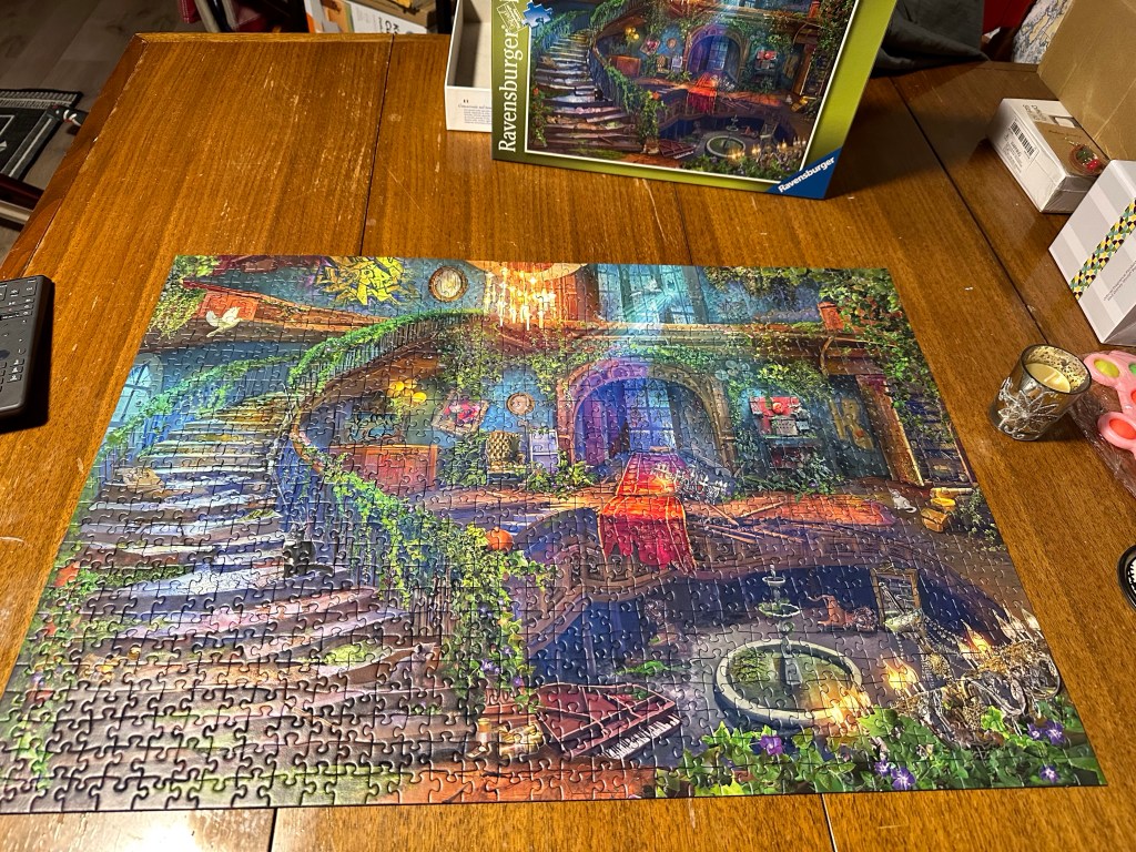 It was a stay at home, snow day. I did laundry, wrapped Christmas presents, watched Netflix and puzzled. It was wonderfully relaxing and I am now ready to full steam ahead into the season. I finished watch the sci fi series I was into, and can’t even recommend it. Just had to see it to the end. The next was “All The Light We Cannot See” which was fabulous, a must watch. Now I am watching the oddest mockumentary, Cunk on Earth. I loved today’s advent earrings