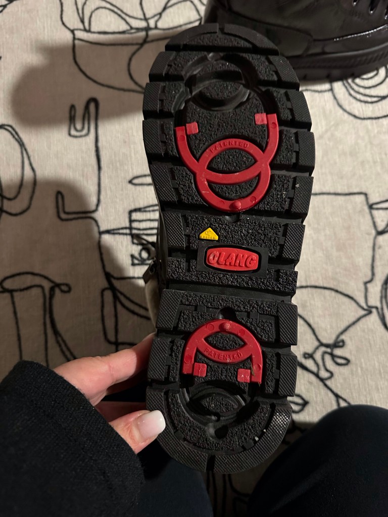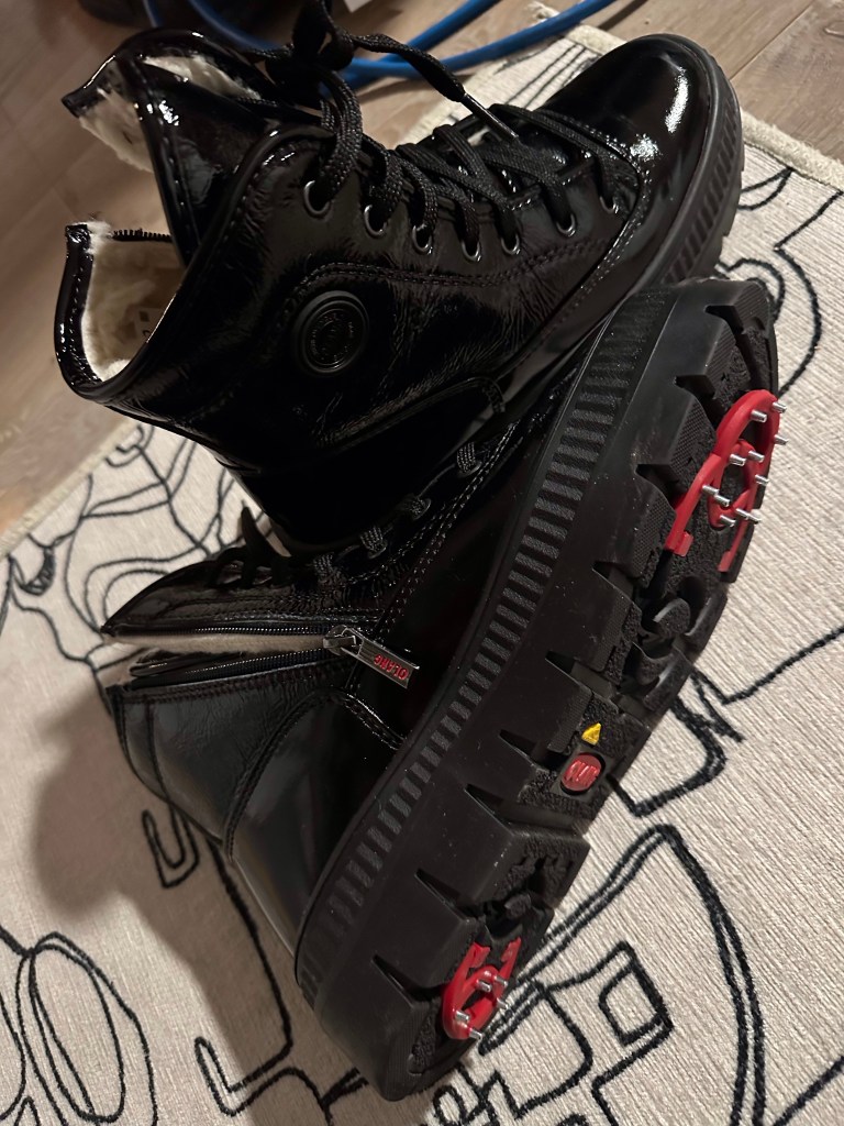I got some chores done this morning and then headed to Talaria Footware as they made a post last night that the boots I saw in the window were going to be 25% off today only. I chose between quite a few and settled back on the black shiny ones. They are lined, high enough to be over the average snow line, waterproof, zip up and, the really big and, is that they have flip down cleats!