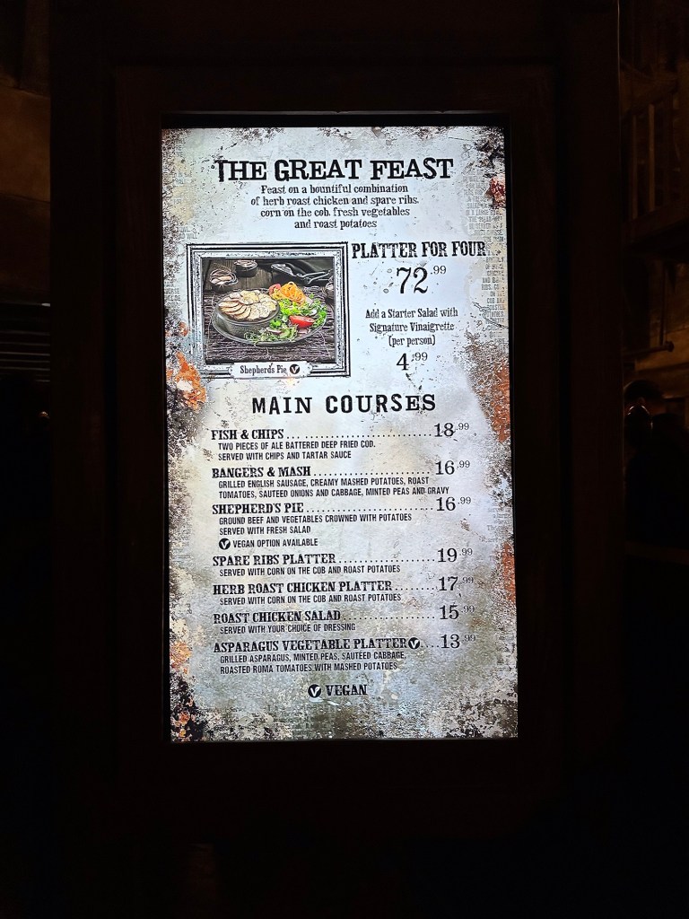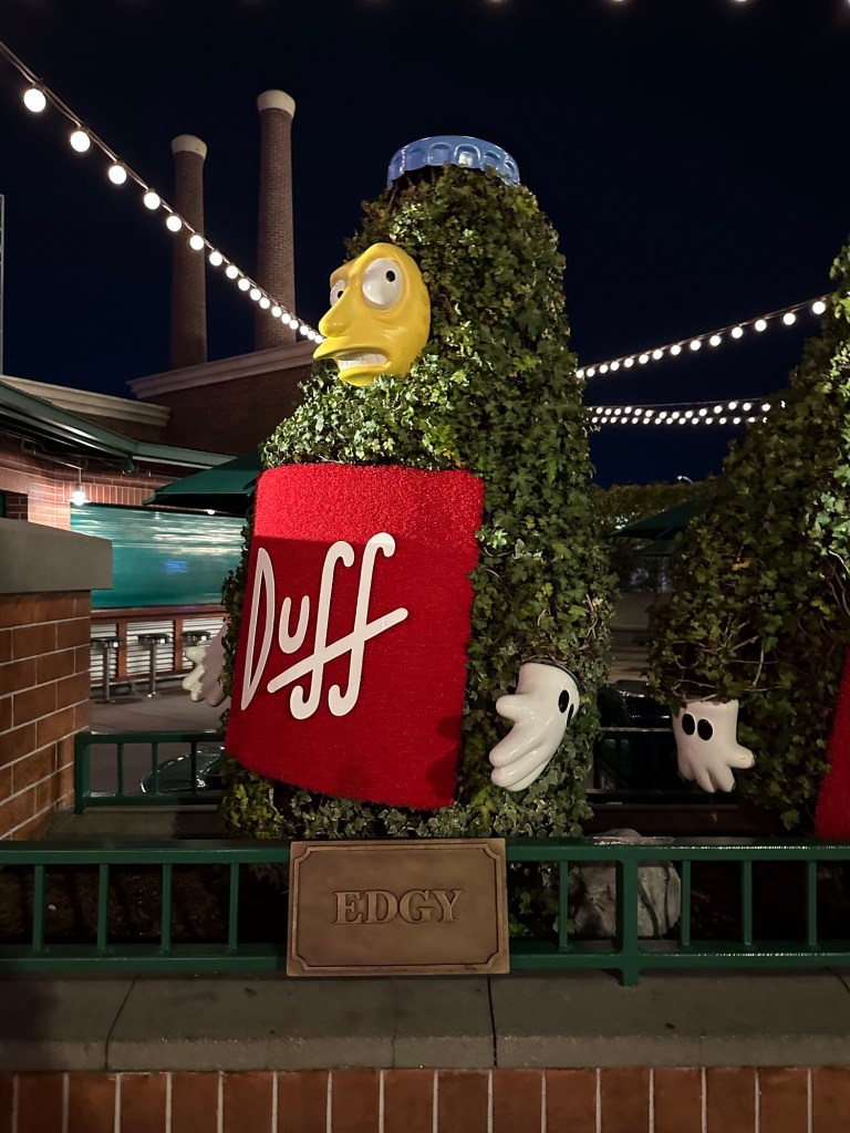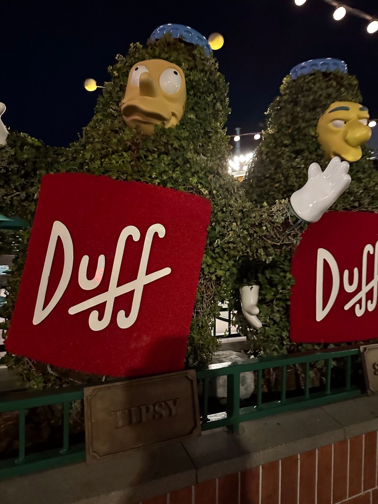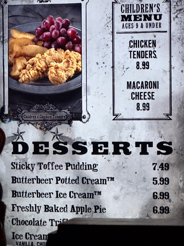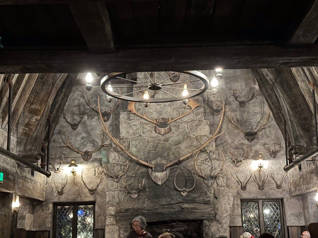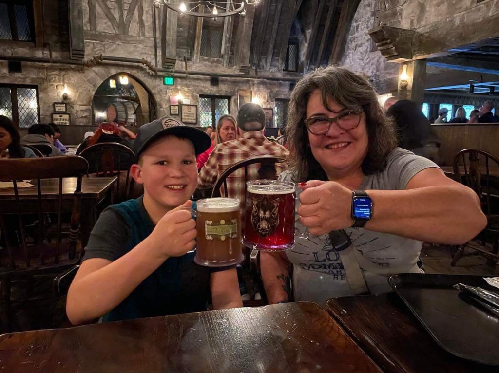 We decided everyone needed food so headed out of the area, up the big levels of escalators, through Springfield and stopped at various places to eat. Rae, Roger, Gene, Will, Sawyer and I all ate at Three Broomsticks in the Harry Potter area. It was so delicious and I bought special ButterBeer in a collector glass for Will and Dragon Scale Lager in a WartHog glass for me.