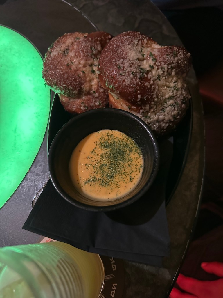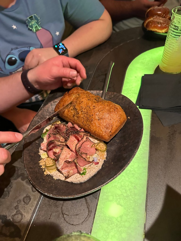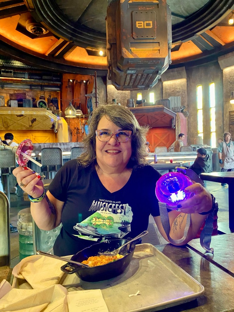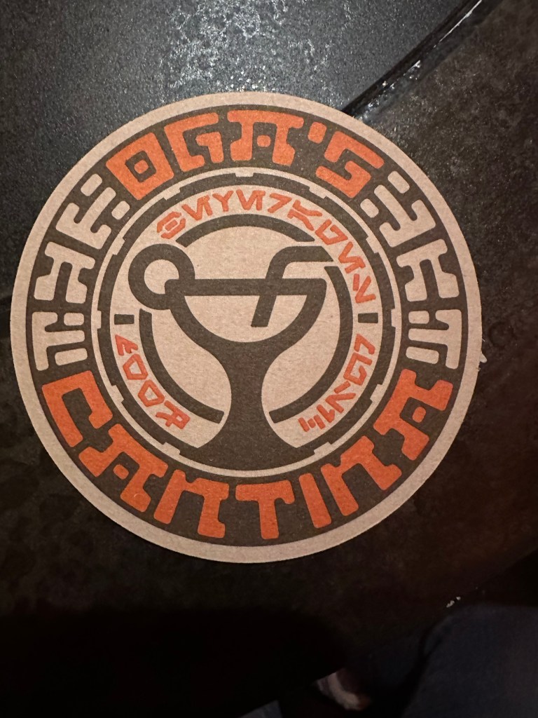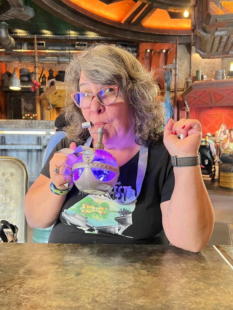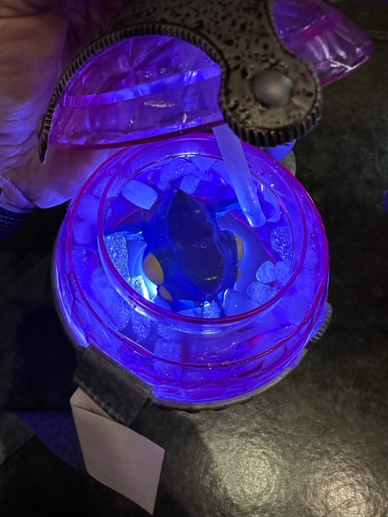We decided everyone needed food so headed out of the area, up the big levels of escalators, through Springfield and stopped at various places to eat. Rae, Roger, Gene, Will, Sawyer and I all ate at Three Broomsticks in the Harry Potter area. It was so delicious and I bought special ButterBeer in a collector glass for Will and Dragon Scale Lager in a WartHog glass for me.