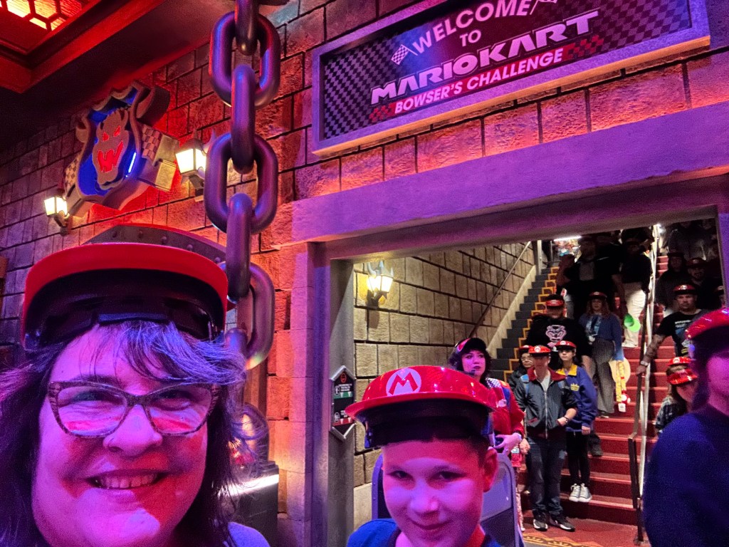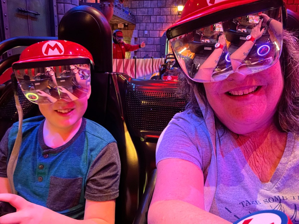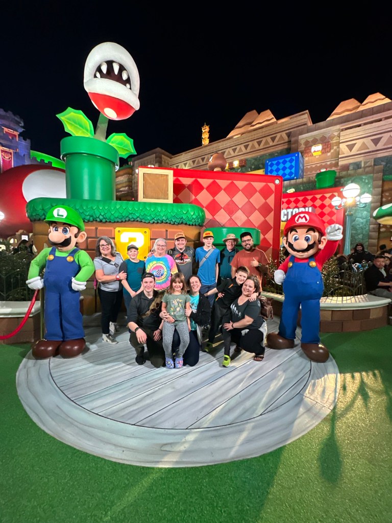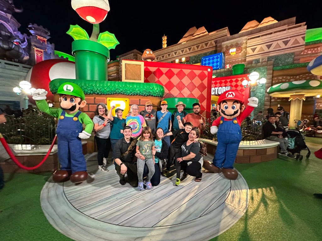 It was all just so much fun and overstimulating and we were already exhausted. The pictures tell the stories but the highlights for me were definitely Super Mario World. I hung with the three youngest and we had a lot of fun as I bought the OneUp Band and we could play all the fun games together while the others were all in a very long line to do Mario Kart Racing. I don’t think any of them thought it was worth the wait. I was so glad that I got in the line for pictures with Mario and Luigi as everyone came together for the first real time all day and we got some great shots. That was on my list of must do while here. Luigi was a little frisky, lol. He kept squeezing me and hip bumping. I thought it was hilarious.