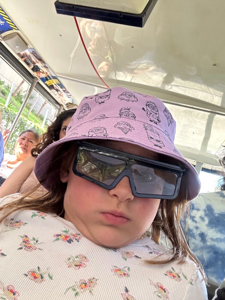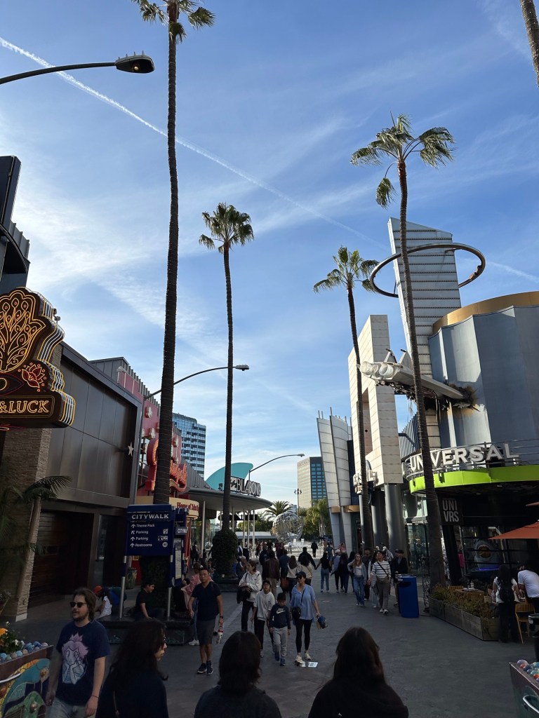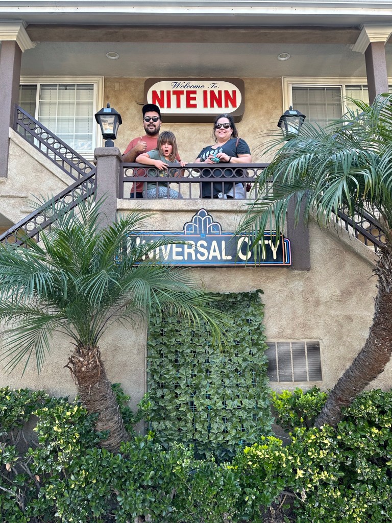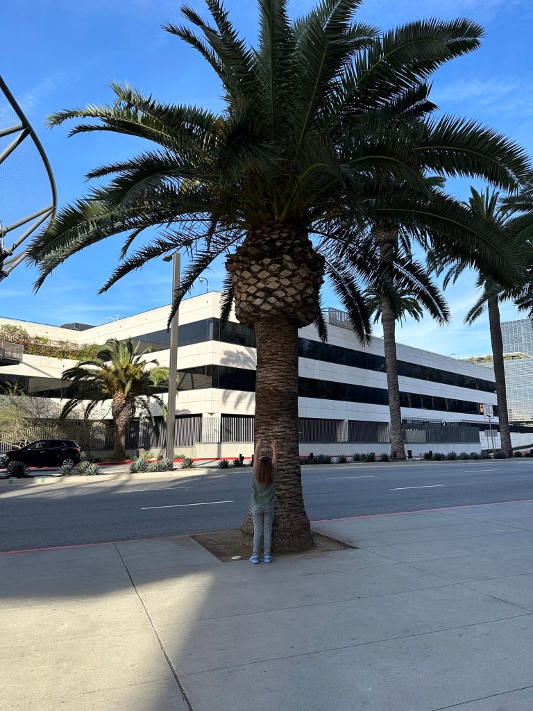 I was super impressed with the Alamo rental vehicle they had for us. It is a 2024 Chrysler Pacifica with all the bells and whistles and a leather interior. It will take 7 of us to our hotel near Disneyland on Monday. They even had a booster seat available for us to use as I had also forgotten to get that from Danika. This was actually easier than bringing one. Ashlée was waiting for us at the hotel on Ventura Blvd as I had the tickets to Universal for the 4 of us. We unloaded the car and walked a couple blocks to the stop for the shuttle up to Universal City and Studios. Emmy was so excited to get a picture with an actual palm tree