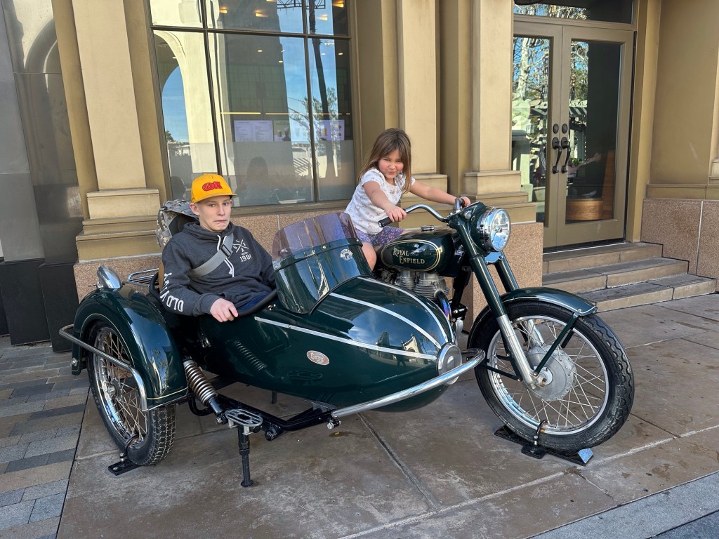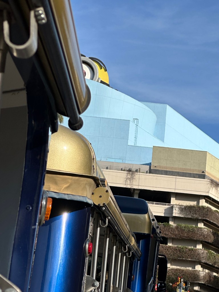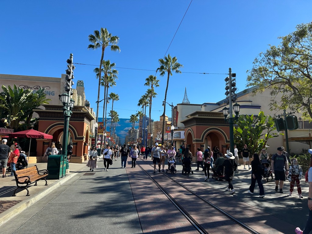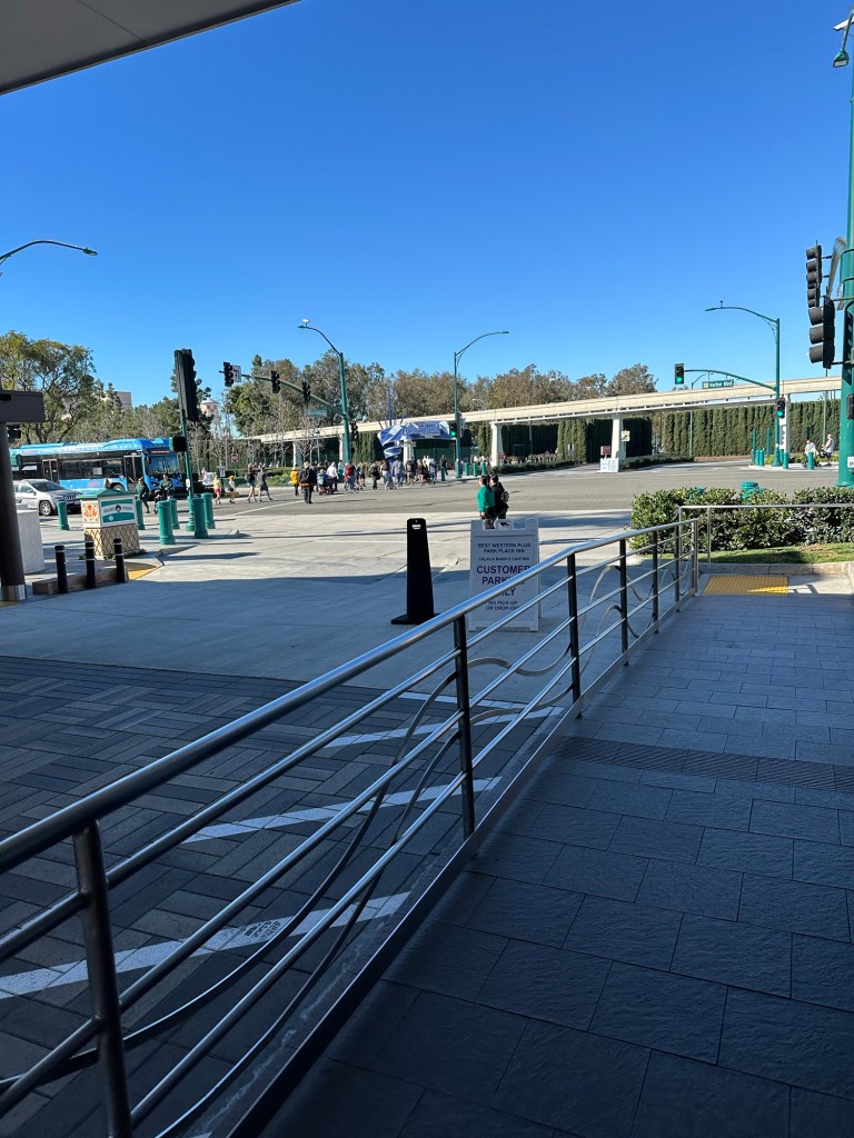 I was super impressed with the Alamo rental vehicle they had for us. It is a 2024 Chrysler Pacifica with all the bells and whistles and a leather interior. It will take 7 of us to our hotel near Disneyland on Monday. They even had a booster seat available for us to use as I had also forgotten to get that from Danika. This was actually easier than bringing one. Ashlée was waiting for us at the hotel on Ventura Blvd as I had the tickets to Universal for the 4 of us. We unloaded the car and walked a couple blocks to the stop for the shuttle up to Universal City and Studios. Emmy was so excited to get a picture with an actual palm tree