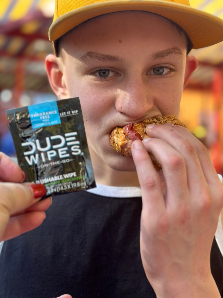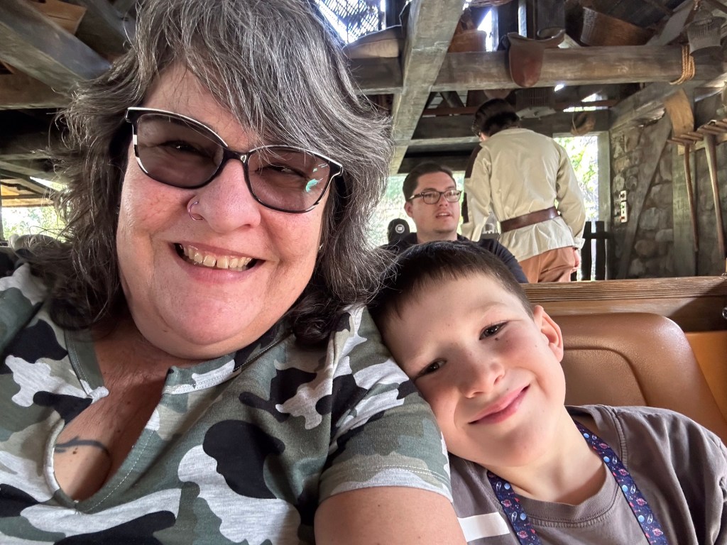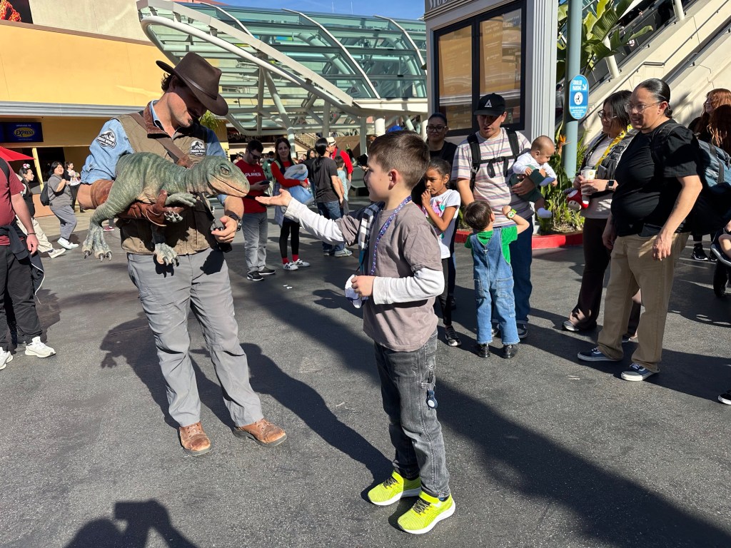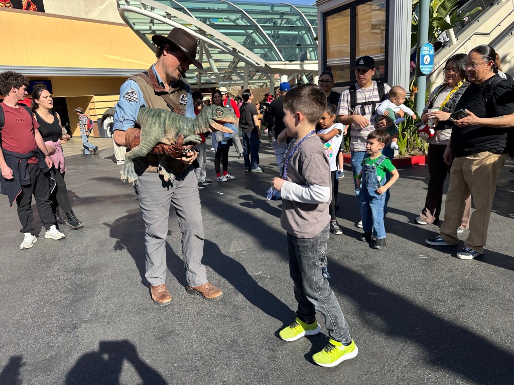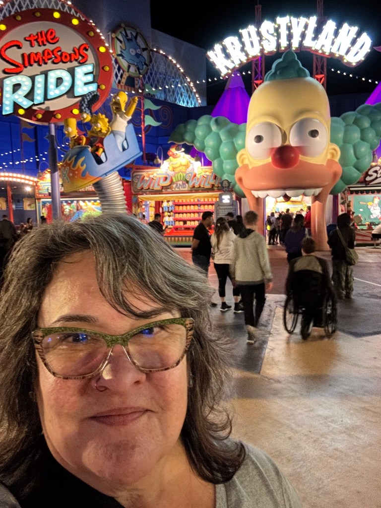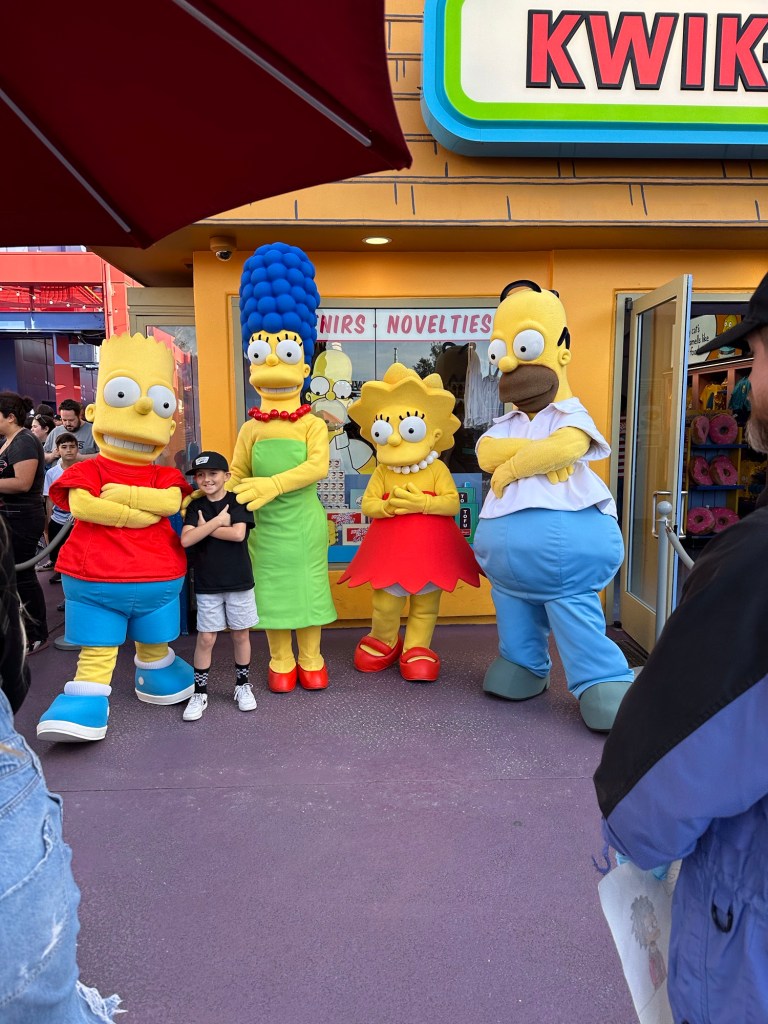 Krusty the Clown was next and then we ate wicked awesome corn dogs while the kids enjoyed the dinosaurs. Sawyer is absolutely convinced that he helped train a real one. He is just so adorable. I tried to video it but it didn’t work. We rode the Jurassic Park ride next and got wet and had fun before Sawyer and I rode the Transformers one and then met the Simpsons and got a pic with Krusty!! I shared a Lard Lad Donut with everyone before we went on the KungFu Panda adventure and shopped out way out of the park.