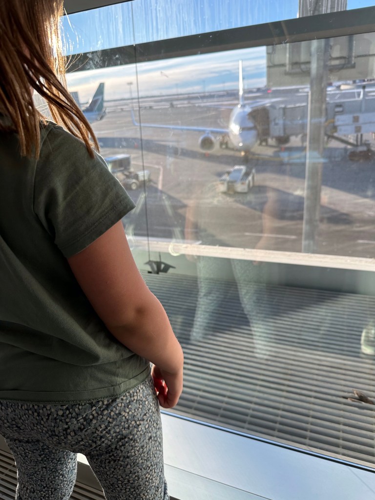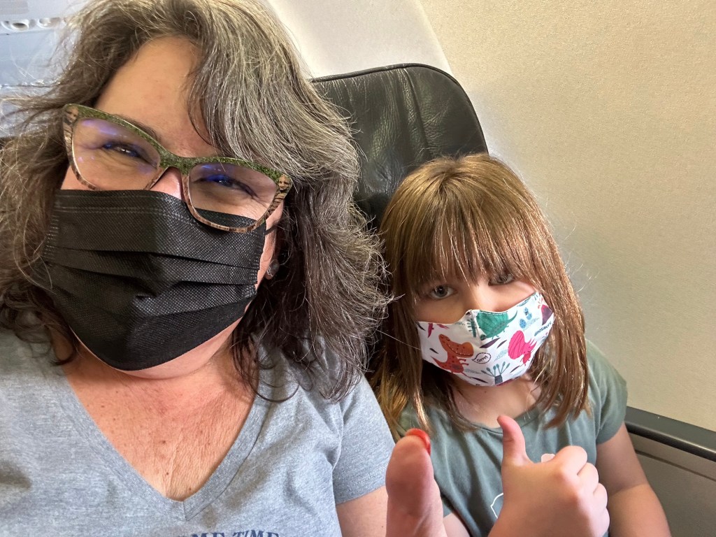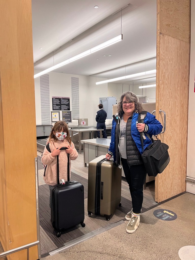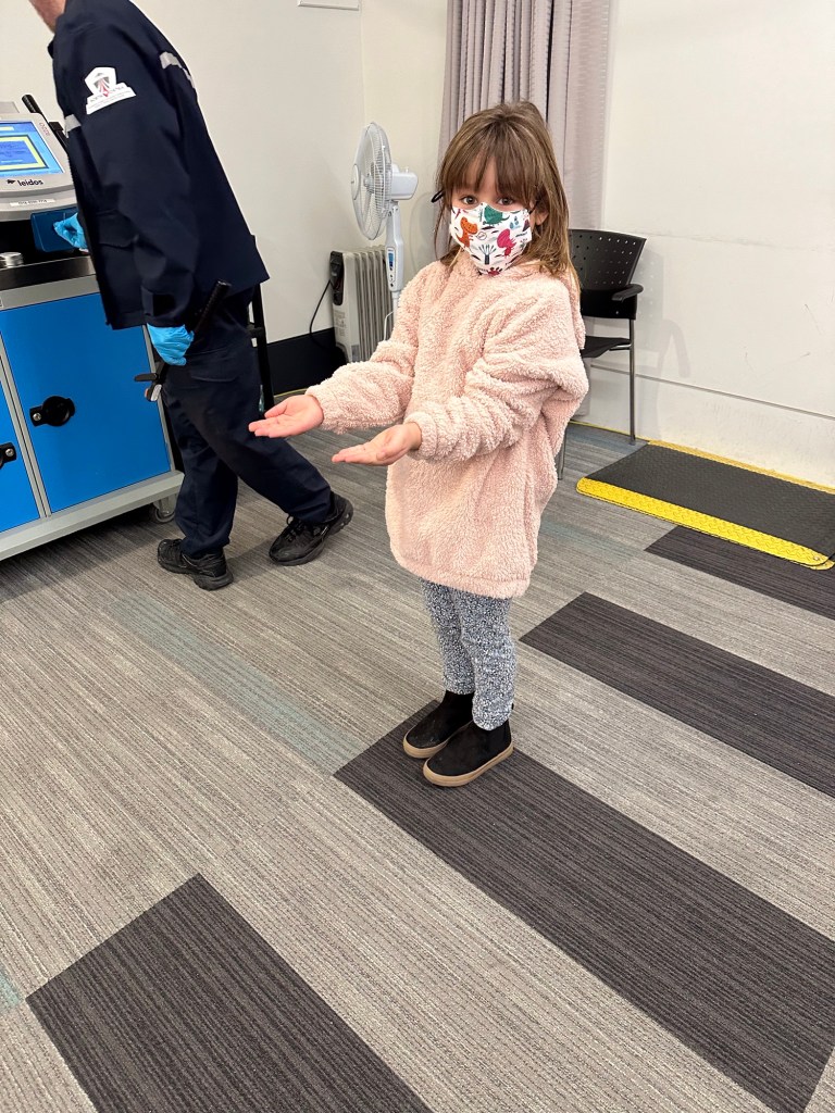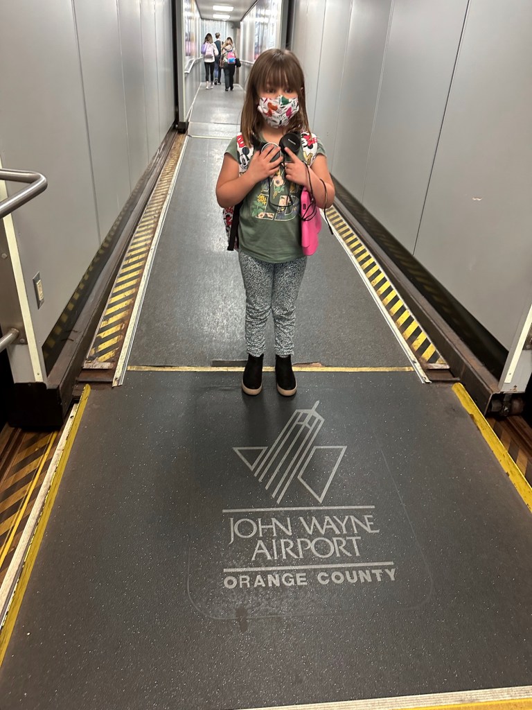 Everyone was there already with Emmy on the way. I got so caught up with the excitement of getting her through, especially after she was random selected for swabbing, that I forgot to pay for my parking and the app did not function well so I was advised by the WestJet agent just to use the kiosk. It was 64 for the week! Back through security again and finally we were loading and on our way. It was a small plane to Calgary and a bit bumpy but everyone seemed to take it well. Once in Calgary Emmy and I used the moving sidewalks for the first part of our long way between gates and then caught the cool shuttle the rest of the way. We had stopped at Duty Free and I didn’t feel guilty at all about putting it in her suitcase. We were on a flight to a different airport and left an hour later than everyone else so we sat and I had breakfast while she managed to spill her apple juice. Thankfully none got on any travel stuff. We were able to check her carry on through for free and that helped a lot. Unfortunately we got the only row with a window seat with no window. That was disappointing but we rolled with it and had a very nice journey. She coloured and modeled clay and snacked on goldfish and listened to music and chatted. I read and napped a bit and chatted. I had bought a travel pillow years ago and finally tried it out. I love it!! It attaches to the seat so it supports your head and cushions it in an upright positions and fits back into a lovely bag. And finally we were landed in California.
