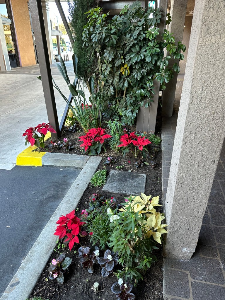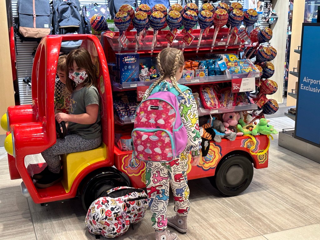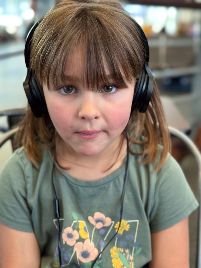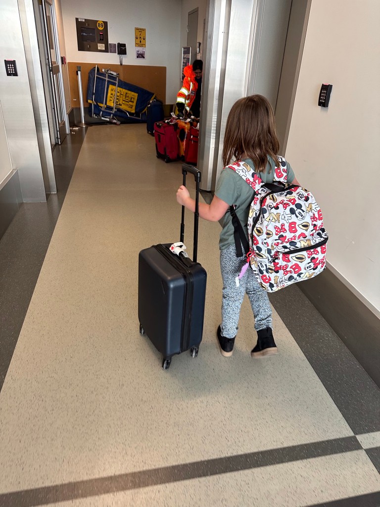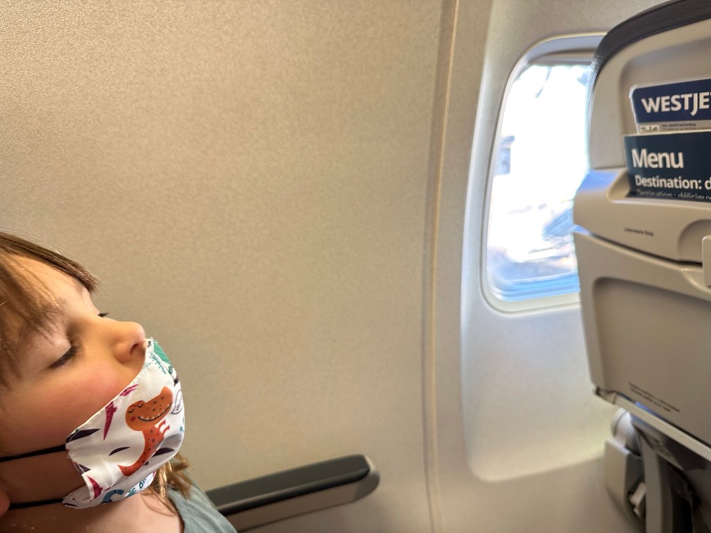 Everyone was there already with Emmy on the way. I got so caught up with the excitement of getting her through, especially after she was random selected for swabbing, that I forgot to pay for my parking and the app did not function well so I was advised by the WestJet agent just to use the kiosk. It was 64 for the week! Back through security again and finally we were loading and on our way. It was a small plane to Calgary and a bit bumpy but everyone seemed to take it well. Once in Calgary Emmy and I used the moving sidewalks for the first part of our long way between gates and then caught the cool shuttle the rest of the way. We had stopped at Duty Free and I didn’t feel guilty at all about putting it in her suitcase. We were on a flight to a different airport and left an hour later than everyone else so we sat and I had breakfast while she managed to spill her apple juice. Thankfully none got on any travel stuff. We were able to check her carry on through for free and that helped a lot. Unfortunately we got the only row with a window seat with no window. That was disappointing but we rolled with it and had a very nice journey. She coloured and modeled clay and snacked on goldfish and listened to music and chatted. I read and napped a bit and chatted. I had bought a travel pillow years ago and finally tried it out. I love it!! It attaches to the seat so it supports your head and cushions it in an upright positions and fits back into a lovely bag. And finally we were landed in California.