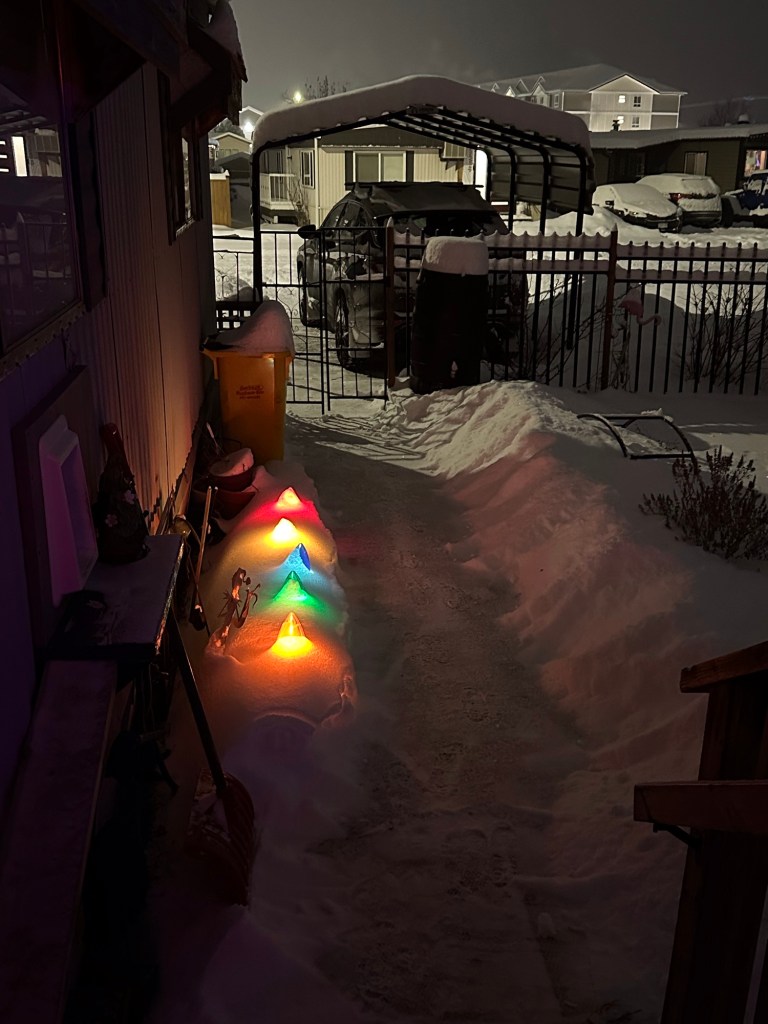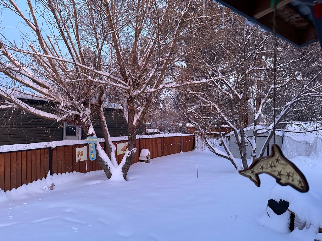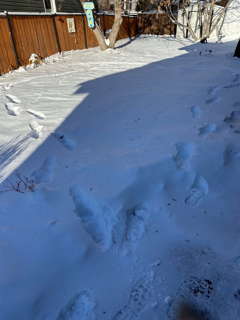 When I got ready and was leaving, I saw that there was a circle of footprints in my yard. I am going to hope it was the neighbour a couple of doors down coming to capture their Tom cat and take it back home. Easy to see its tracks coming from their house and trying to get into mine. I have actually blocked the cat door completely now though and Missy doesn’t want to go out in this cold anyway.