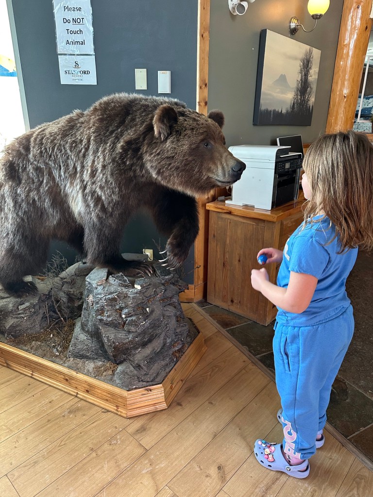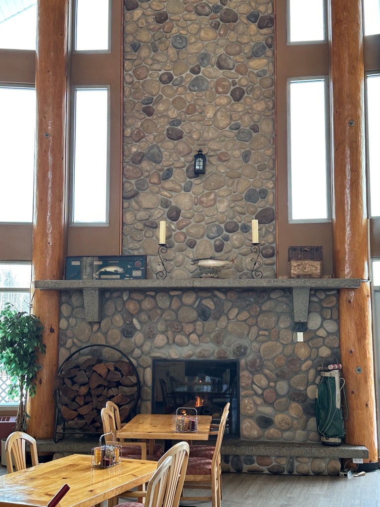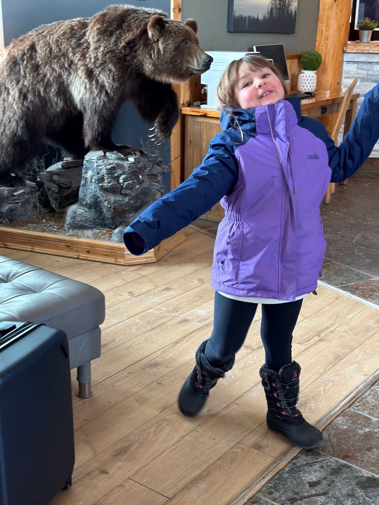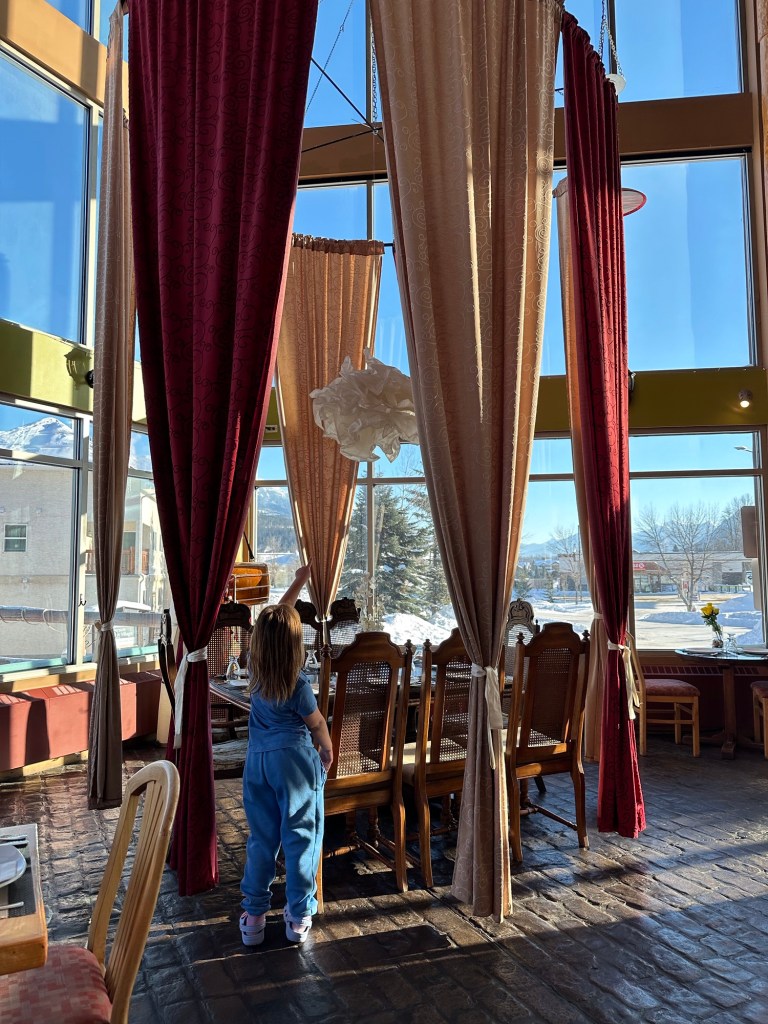 I was rudely awoken at 2:08 am by the Hotel fire alarm sounding. The best part of all was that Emmy slept through it and it ended fairly soon. I was thinking at the time that if she woke up and it kept going, we would just pack up and leave. I was not going to stand out in the cold. When I talked to the man at the desk in the morning he said one of the roof sensors had frozen causing the false alarm. I also asked him if the hockey teams were there regularly and he said yes, them or the Cat Skiers who would have been far noisier. It is a great family hotel for sure but not if you have an early to bed light sleeper. Emmy woke me up an hour after she woke up which was pretty great. Also good that she slept until nearly 7. We went to breakfast in our jammies and I enjoyed my waffle and she, her fruit loops. I loved the great room it was in with the lovely fire going. I was only slightly unnerved by the croquet mallets in the golf bag on the hearth a la The Overlook Inn.